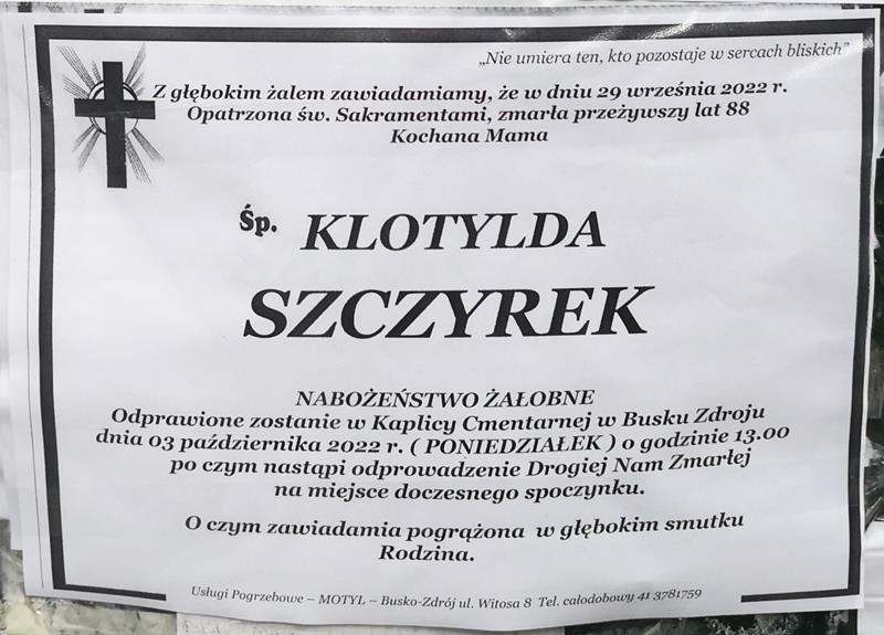 ⬛ NEKROLOGI 2022 [26 września ÷ 2 października]: +Jerzy Szymczyk, +Józef Kozłowski, +Klotylda Szczyrek, +Zofia Motyka - Internetowy Portal Informacyjny Mieszkańców Miasta i Gminy Busko-Zdrój