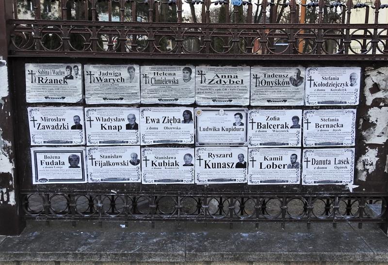 ○ grafika tytułowa: Tomaszów Mazowiecki, 10.04.2023: nekrologi przy kościele św. Antoniego.