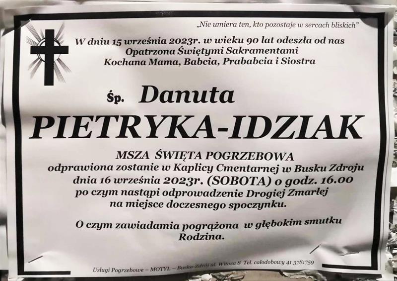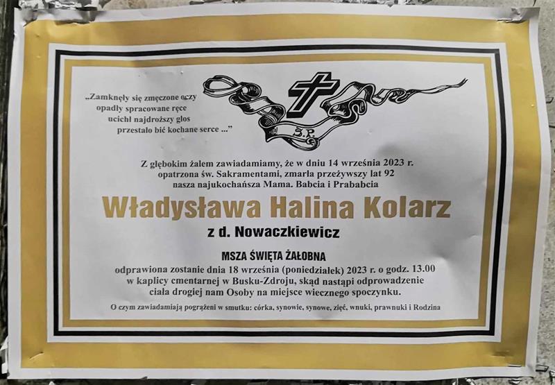 ⬛ NEKROLOGI 2023’37 [ 10 września ÷ 16 września ]: + Krzysztof Woźniak, + Andrzej Mikołajeski, + Helena Magdziak, + Władysława Halina Kolarz z d. Nowaczkiewicz, + Danuta Pietryka-Idziak, + Lucjan Golonka - Internetowy Portal Informacyjny Mieszkańców Miasta i Gminy Busko-Zdrój