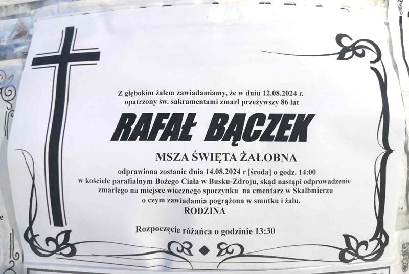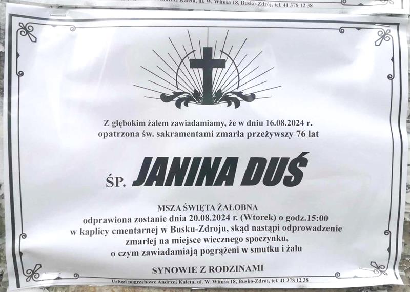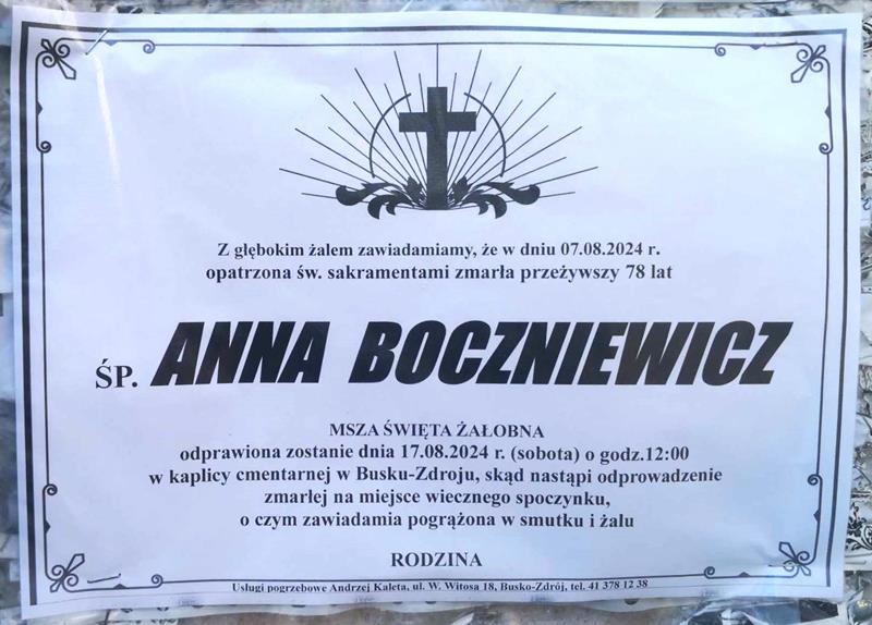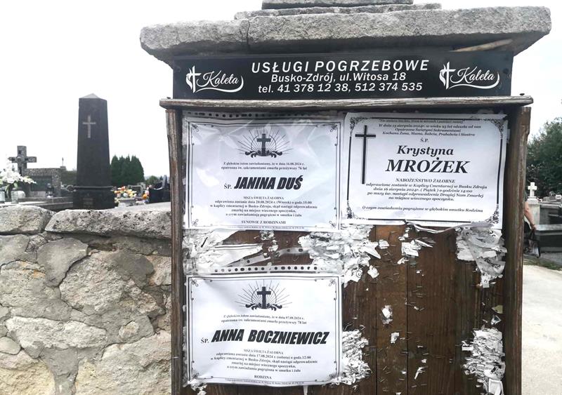 ⬛ NEKROLOGI 2024’33 [ 11 sierpnia ÷ 17 sierpnia ]: +Anna Boczniewicz, +Józefa Kopała, +Monika Kowalska, +Teodora Paniewska ◙ +Rafał Bączek, +Marcin Stępień, +Robert Mazurek, +Krystyna Mrożek, +Janina Duś, +Piotr Władysław Misterkiewicz, +Mieczysław Walasek, +Andrzej Zając - Internetowy Portal Informacyjny Mieszkańców Miasta i Gminy Busko-Zdrój