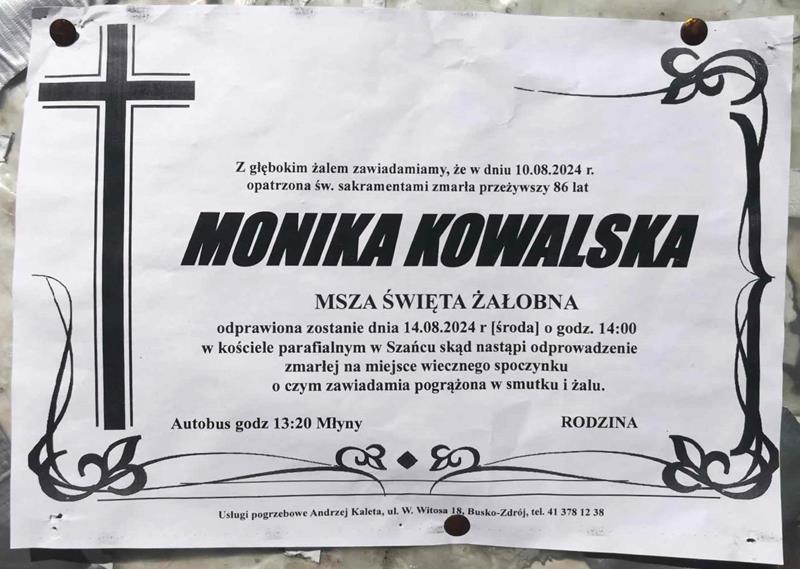 ⬛ NEKROLOGI 2024’32 [ 04 sierpnia ÷ 10 sierpnia ]: +Wojciech Domagała ◙ +Waldemar Kosela, +Władysława Mazur, +Marianna Kosmala, +Anna Boczniewicz, +Jadwiga Jaskólska, +Józefa Kopała, +Monika Kowalska, +Teodora Paniewska