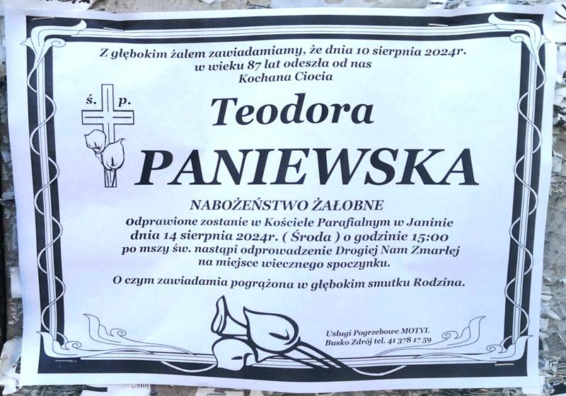⬛ NEKROLOGI 2024’33 [ 11 sierpnia ÷ 17 sierpnia ]: +Anna Boczniewicz, +Józefa Kopała, +Monika Kowalska, +Teodora Paniewska ◙ +Rafał Bączek, +Marcin Stępień, +Robert Mazurek, +Krystyna Mrożek, +Janina Duś, +Piotr Władysław Misterkiewicz, +Mieczysław Walasek, +Andrzej Zając