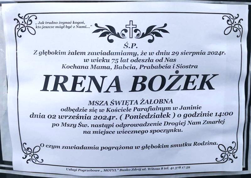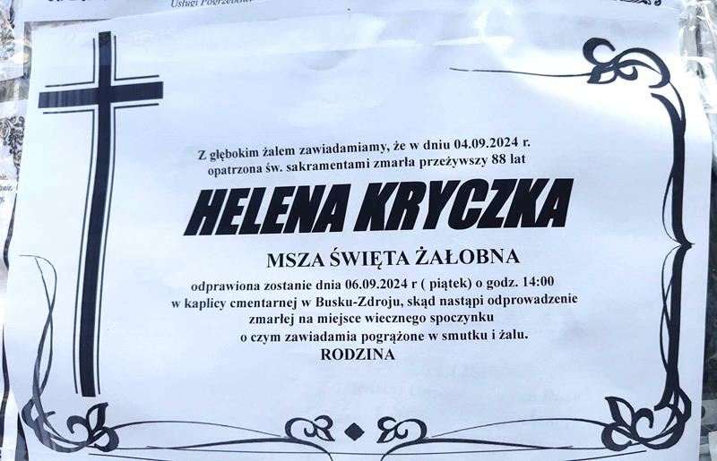 ⬛ NEKROLOGI 2024’36 [ 1 września ÷ 7 września ]: +Irena Bożek, +Józefa Wójcik ◙ +Henryka Chwalik, +Kazimierz Mąkosza, +Helena Kryczka, +Henryk Żydek, +Zofia Sala z d. Ochnicka, +Elżbieta Malinowska