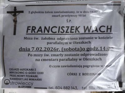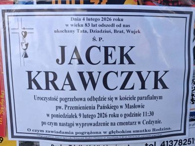 2 odpowiedzi do “⬛ NEKROLOGI 2026’06 [ 1 lutego ÷ 7 lutego]: +Katarzyna Henryka Łukaszek, +Regina Góryjowska, +Bonifacy Służalski, +Agnieszka Siemieniec, +Alfred Stępień, +Jacek Krawczyk, +Franciszek Wach, +Justyna Kuc, +Janusz Barański”