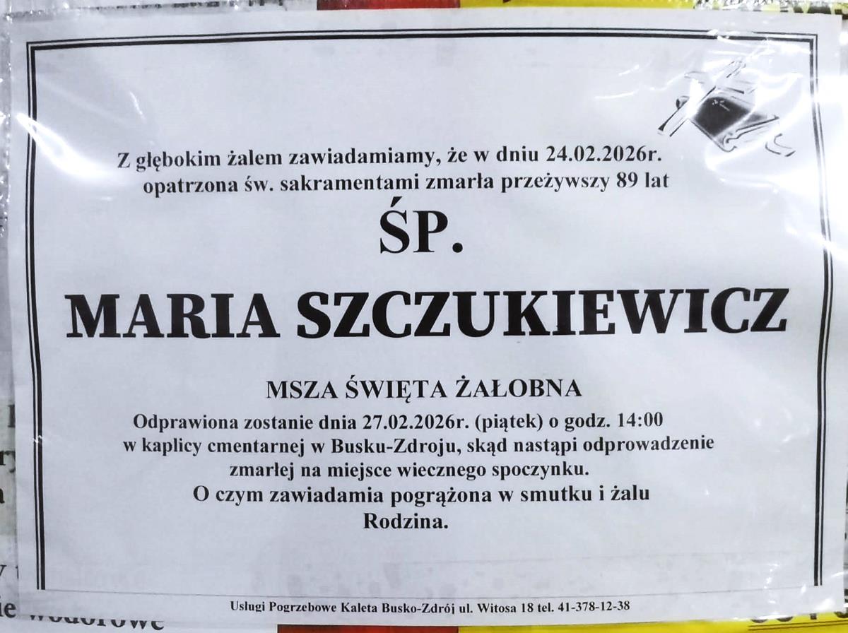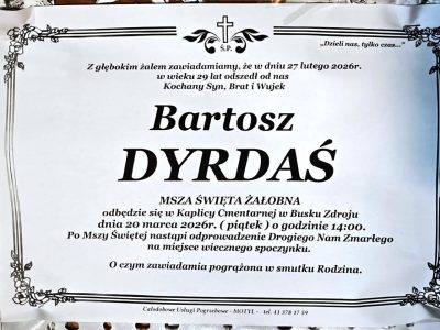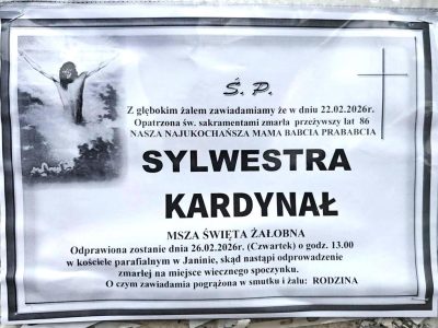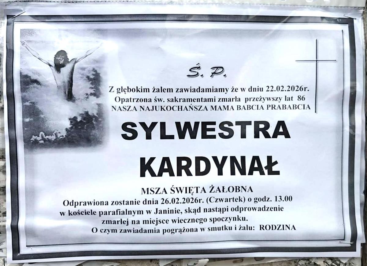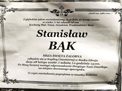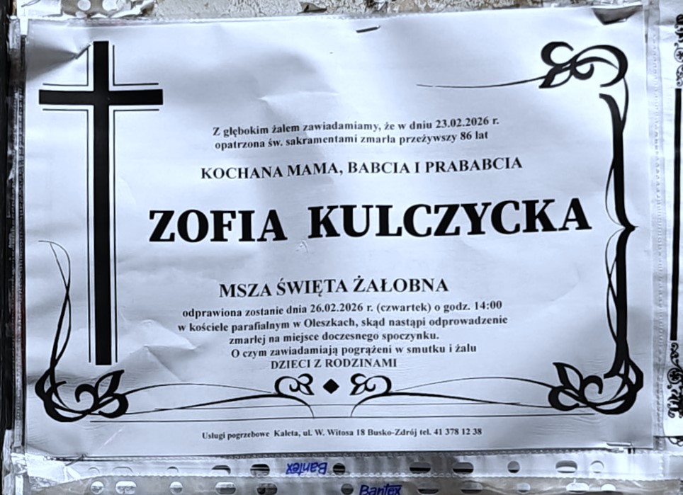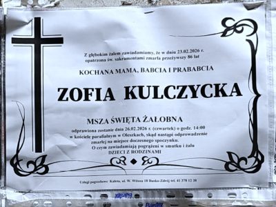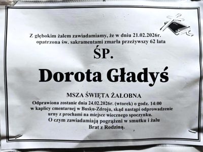 Jedna odpowiedź do “⬛ NEKROLOGI 2026’09 [ 22 lutego ÷ 28 lutego]: +Dorota Gładyś, +Leszek Mierzwa ⬛ +Sylwestra Kardynał, +Zofia Kulczycka, +Maria Szczukiewicz, +Stanisław Bąk, +Eugeniusz Bugajski, +Bartosz Dyrdaś”