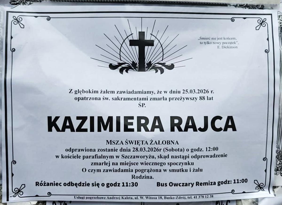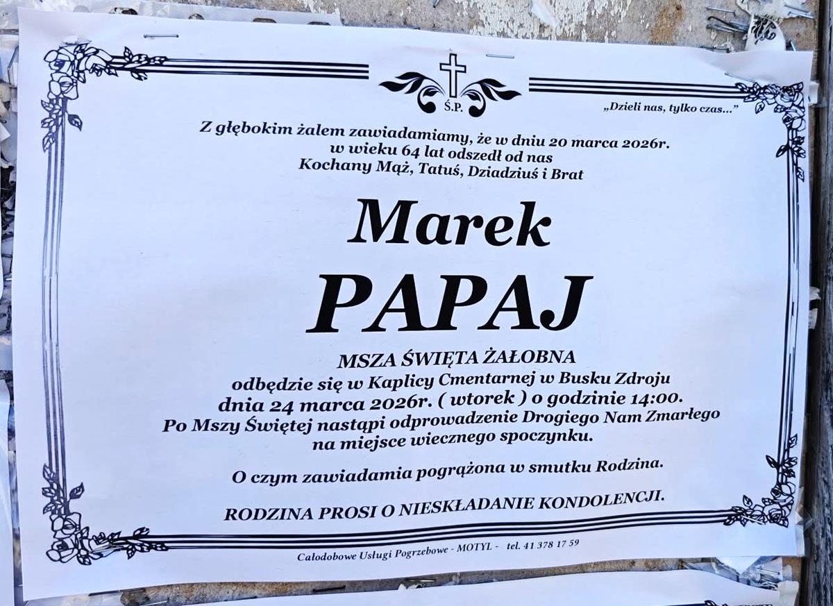 ⬛ NEKROLOGI 2026’13 [ 22 marca ÷ 28 marca]: +Marek Papaj ⬛ +Marta Jagusiak, +Piotr Wójcik, +Józef Kardaś, +Kazimiera Matusik, +Dariusz Stanisław Buczek, +Kazimiera Rajca, +Zbigniew Szczepanik