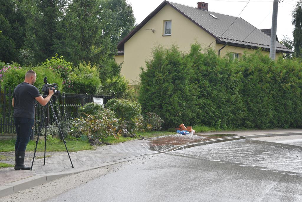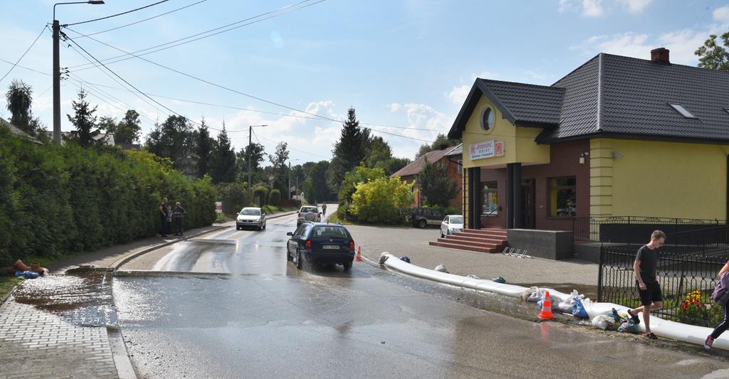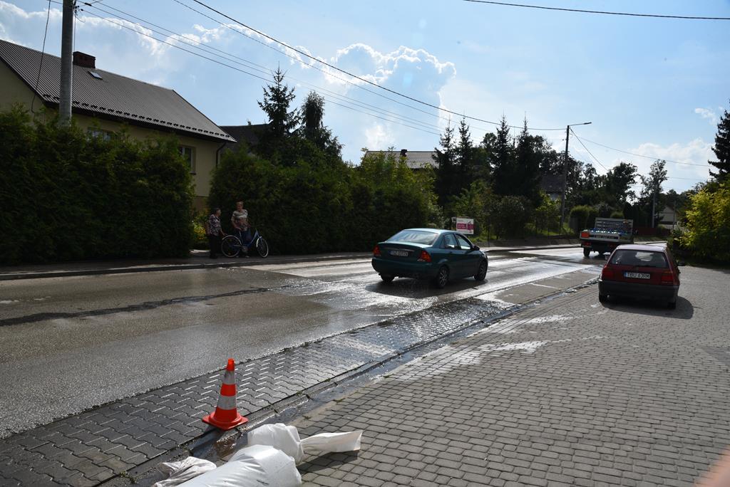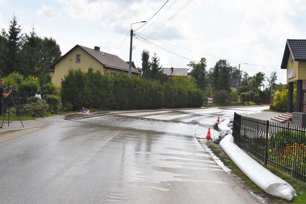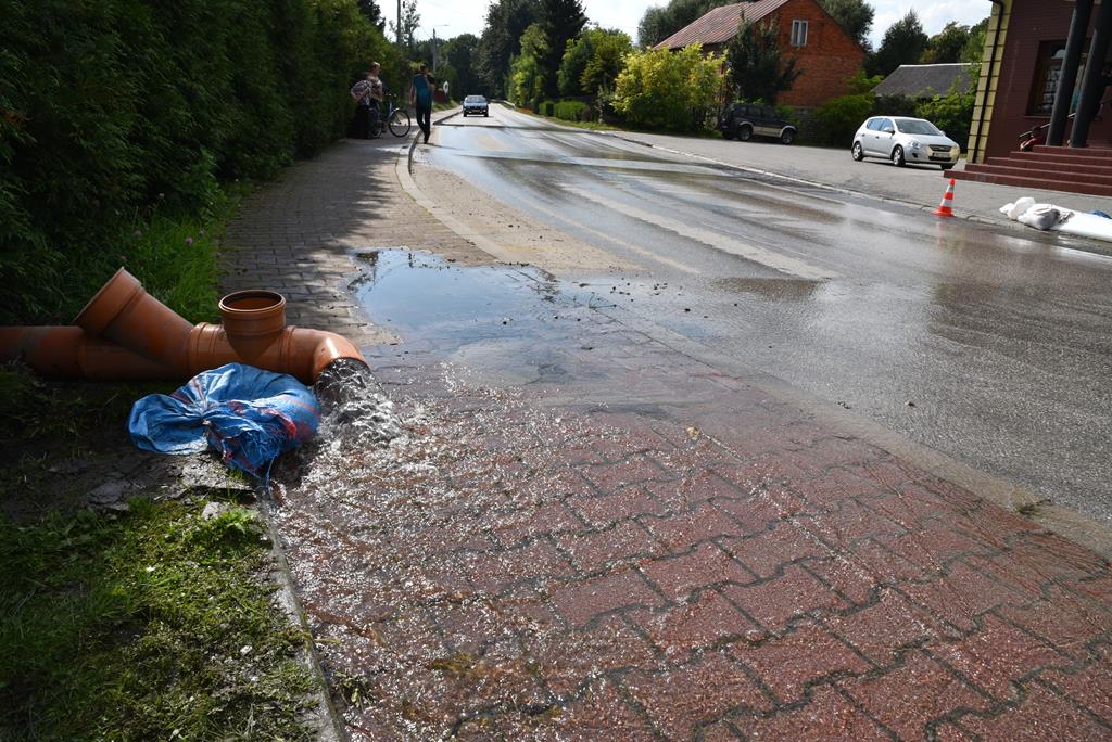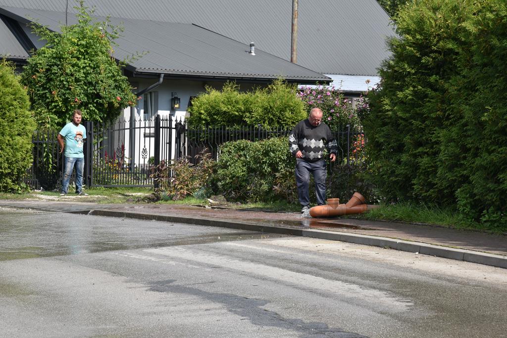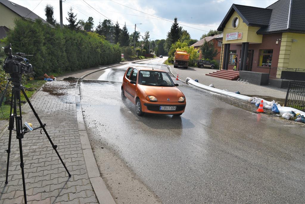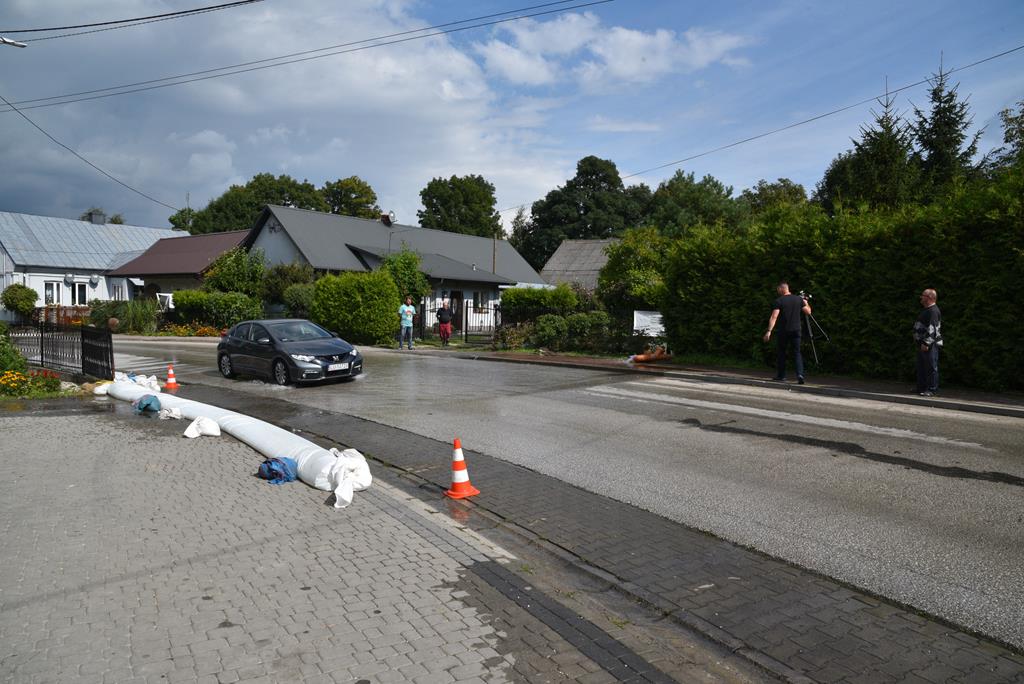 Po przybyciu do wsi z łatwością odnaleźliśmy „zalewowe epicentrum” – przez ulicę na wysokości sklepu wartkim strumieniem o szerokości kilku metrów, wypływająca w głównej mierze z pomarańczowej, ułożonej prowizorycznie kanalizacyjnej rury, woda przelewała się przez asfalt. Po przeciwnej stronie ulicy ustawiony przez strażaków biały rękaw zaporowy blokował ten strumień i kierował go do przydrożnego rynsztoka. Dzięki temu usytuowane poniżej posesje zostały ochronione przed dalszym zalewaniem.