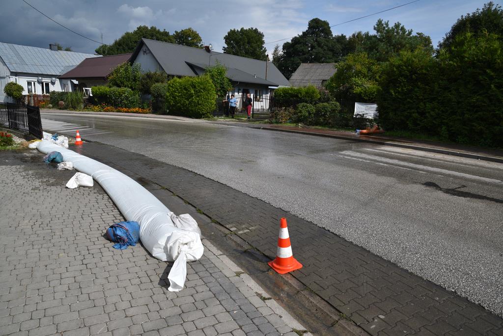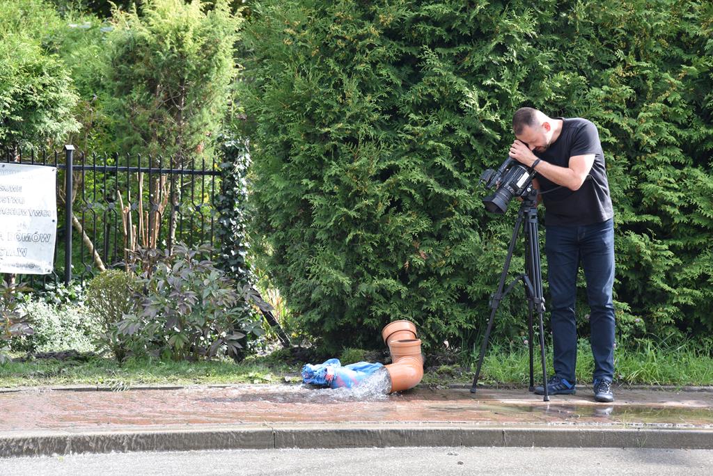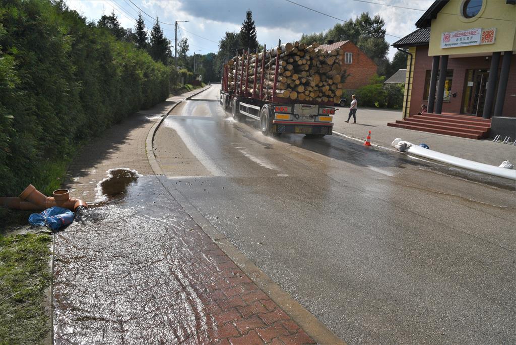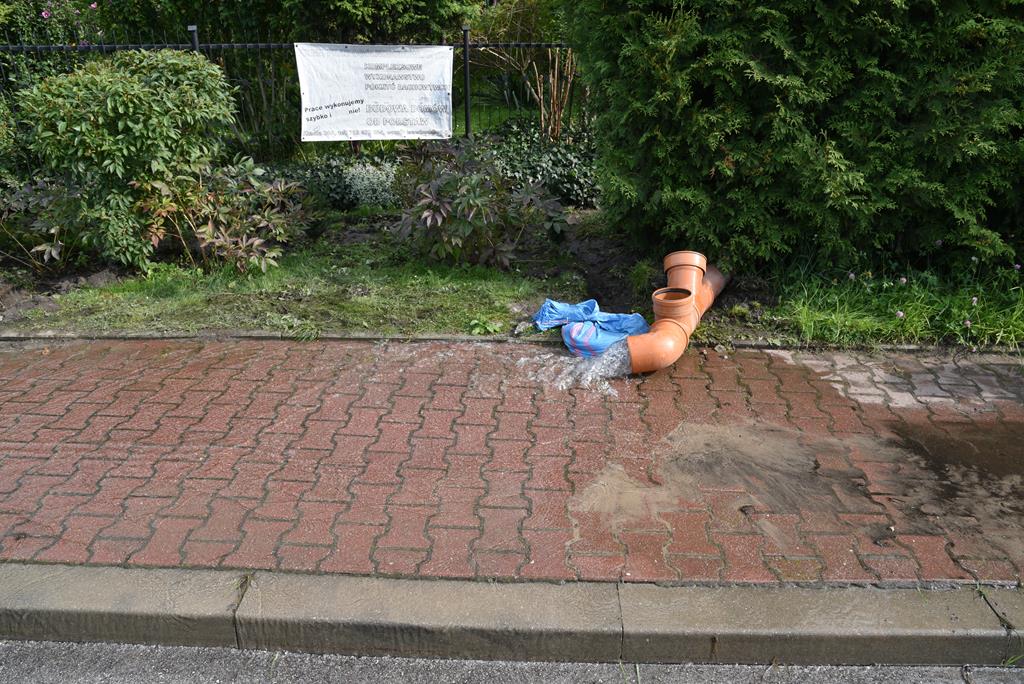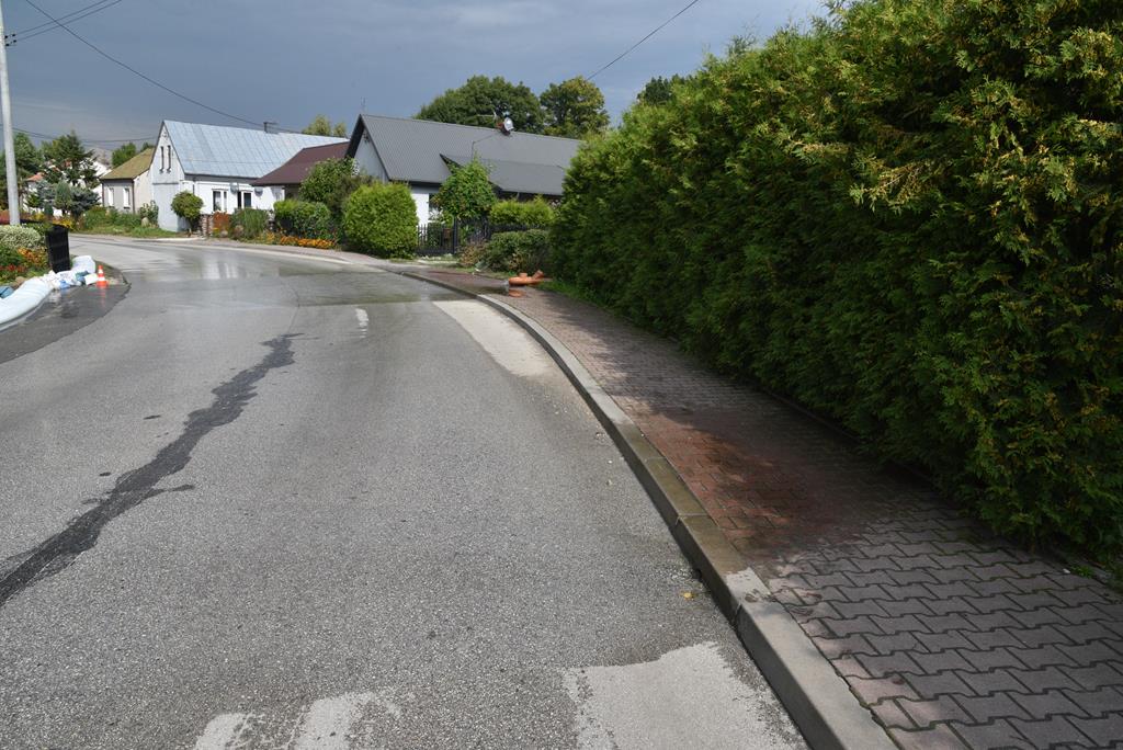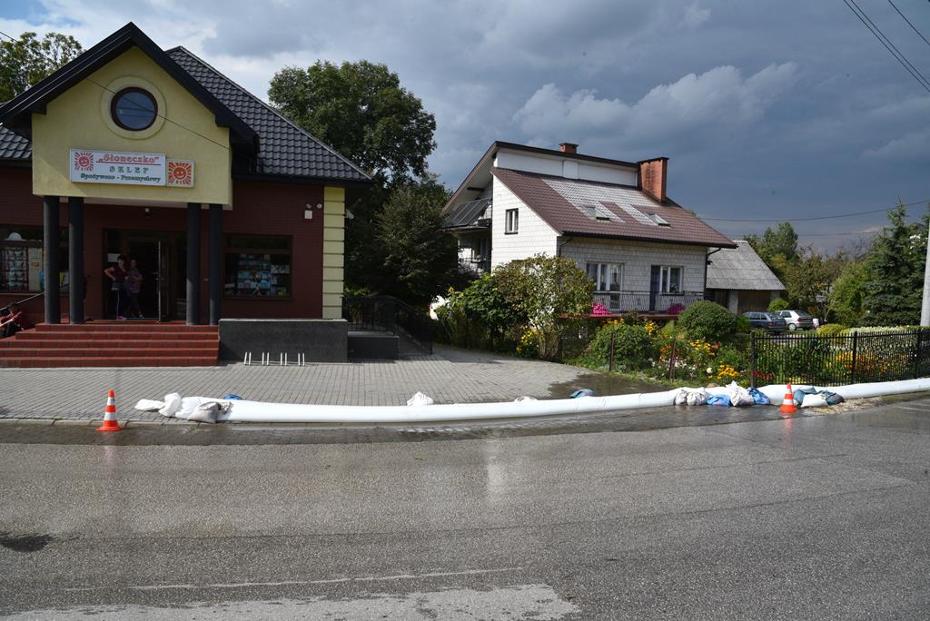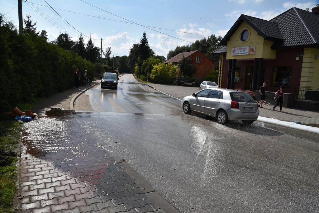 Po przybyciu do wsi z łatwością odnaleźliśmy „zalewowe epicentrum” – przez ulicę na wysokości sklepu wartkim strumieniem o szerokości kilku metrów, wypływająca w głównej mierze z pomarańczowej, ułożonej prowizorycznie kanalizacyjnej rury, woda przelewała się przez asfalt. Po przeciwnej stronie ulicy ustawiony przez strażaków biały rękaw zaporowy blokował ten strumień i kierował go do przydrożnego rynsztoka. Dzięki temu usytuowane poniżej posesje zostały ochronione przed dalszym zalewaniem.