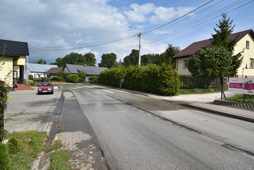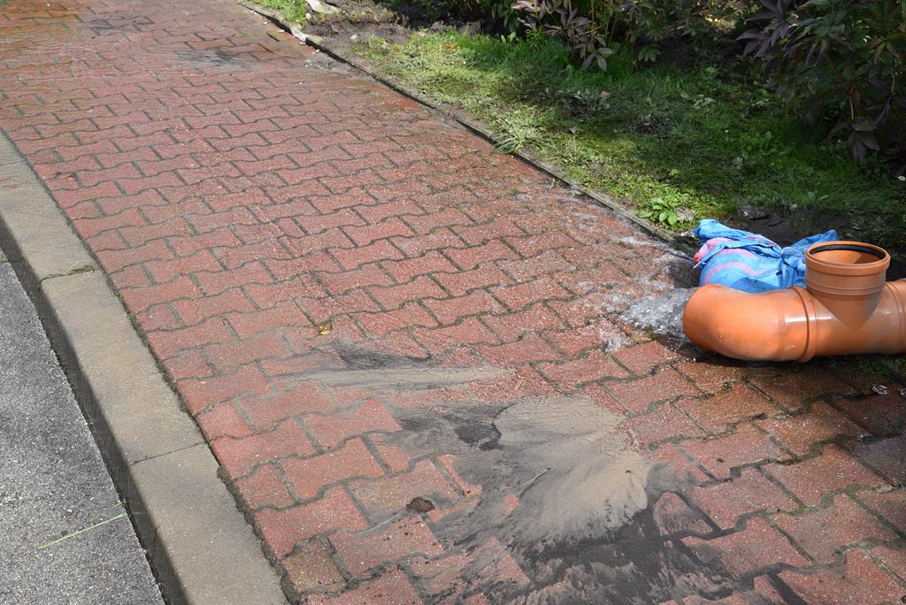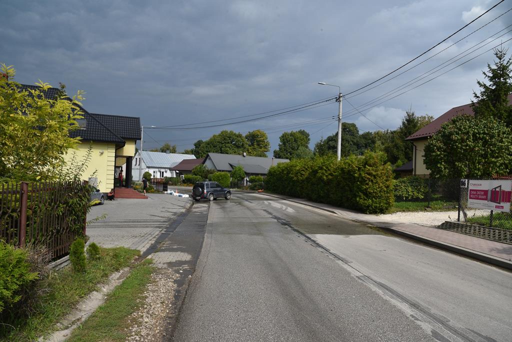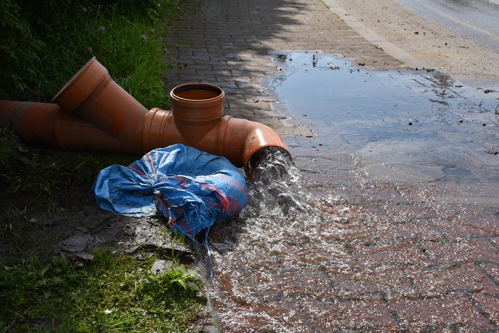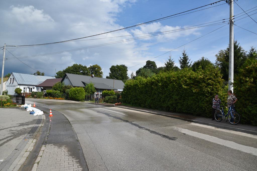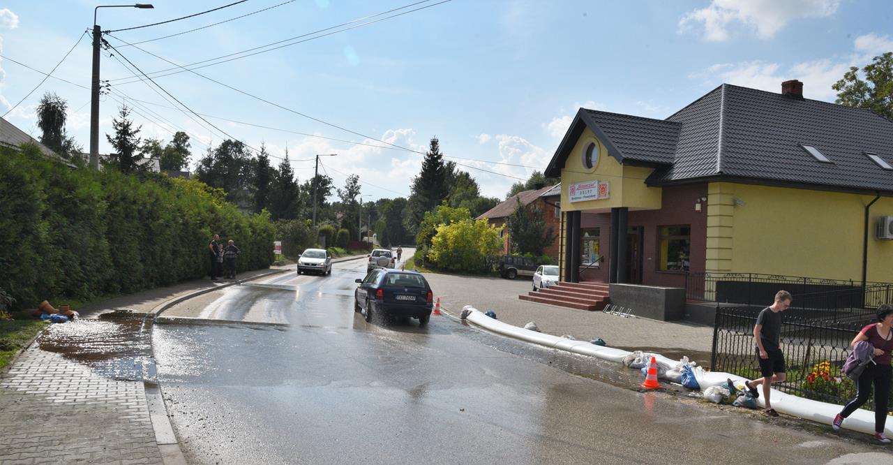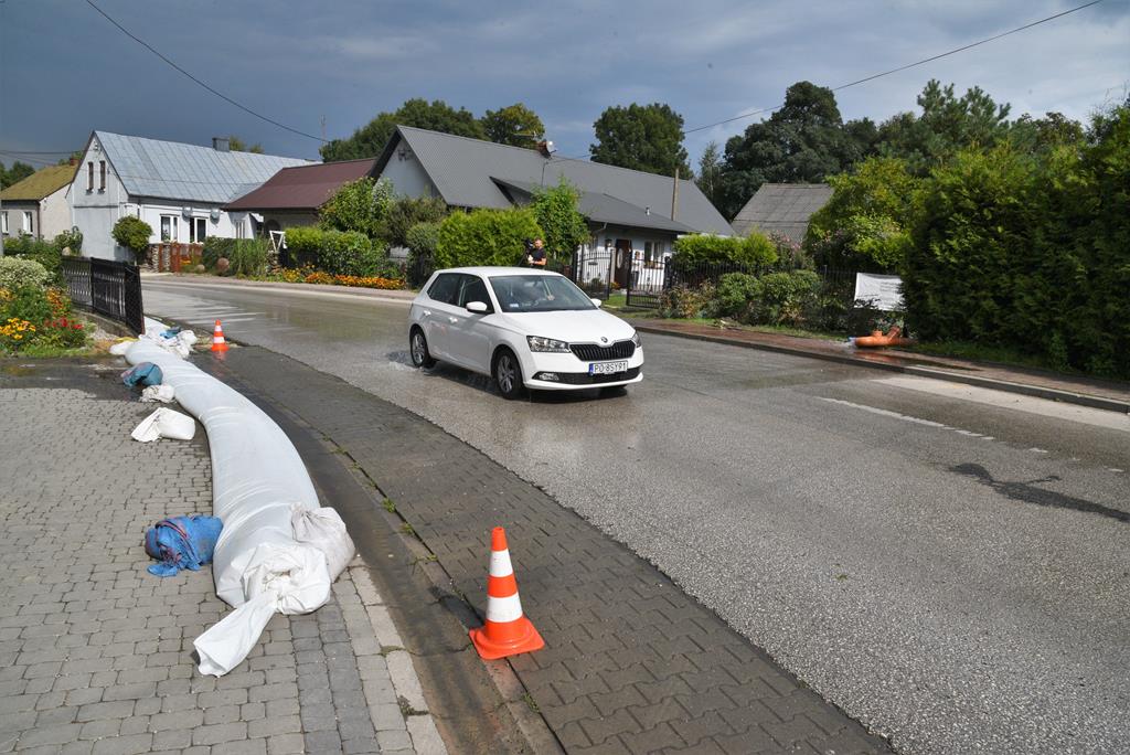 Po przybyciu do wsi z łatwością odnaleźliśmy „zalewowe epicentrum” – przez ulicę na wysokości sklepu wartkim strumieniem o szerokości kilku metrów, wypływająca w głównej mierze z pomarańczowej, ułożonej prowizorycznie kanalizacyjnej rury, woda przelewała się przez asfalt. Po przeciwnej stronie ulicy ustawiony przez strażaków biały rękaw zaporowy blokował ten strumień i kierował go do przydrożnego rynsztoka. Dzięki temu usytuowane poniżej posesje zostały ochronione przed dalszym zalewaniem.