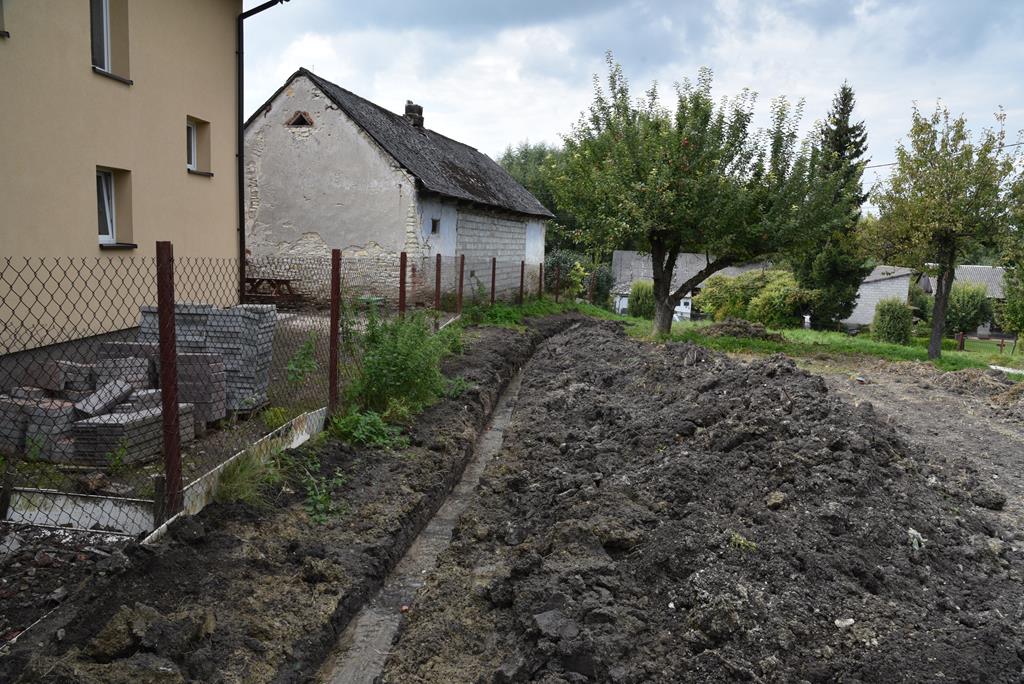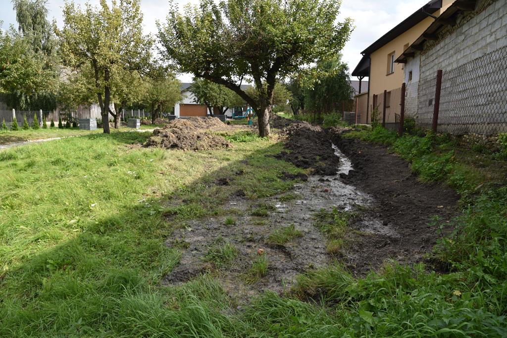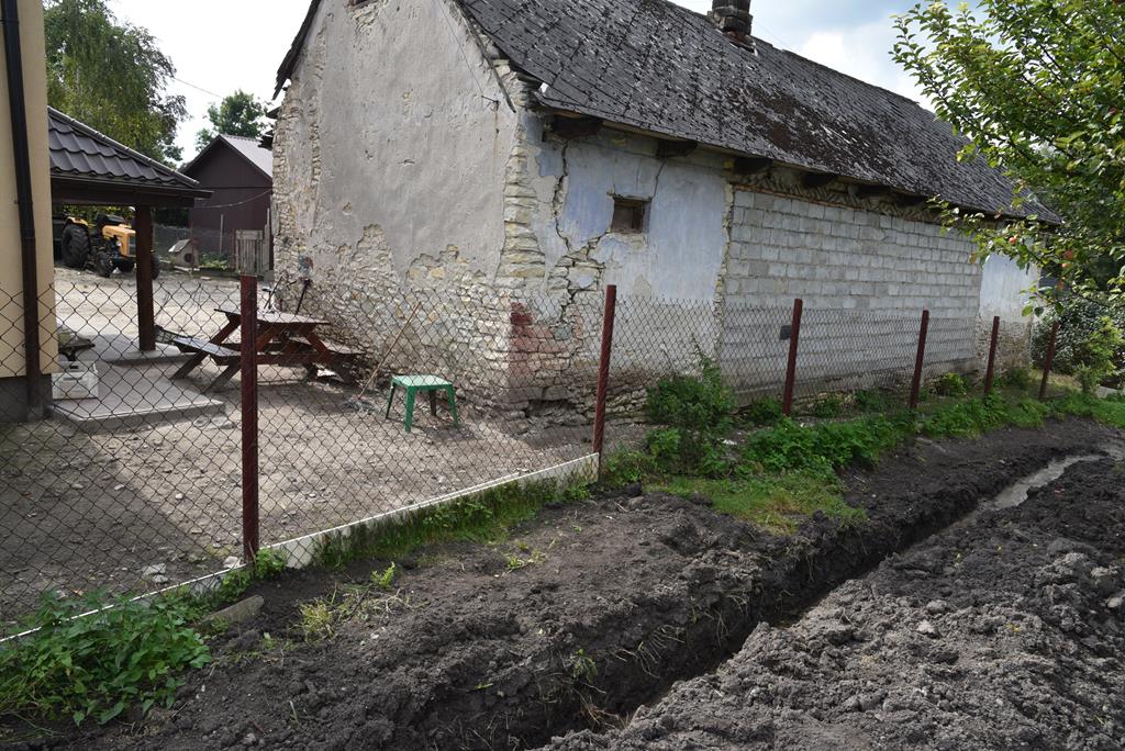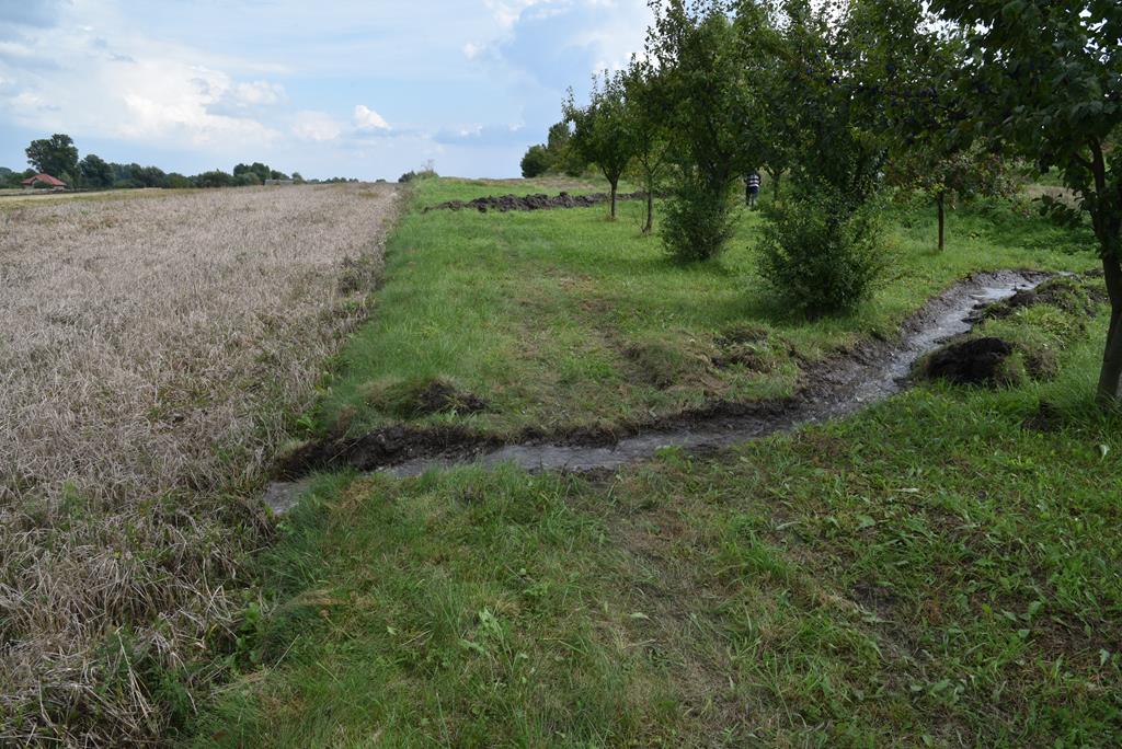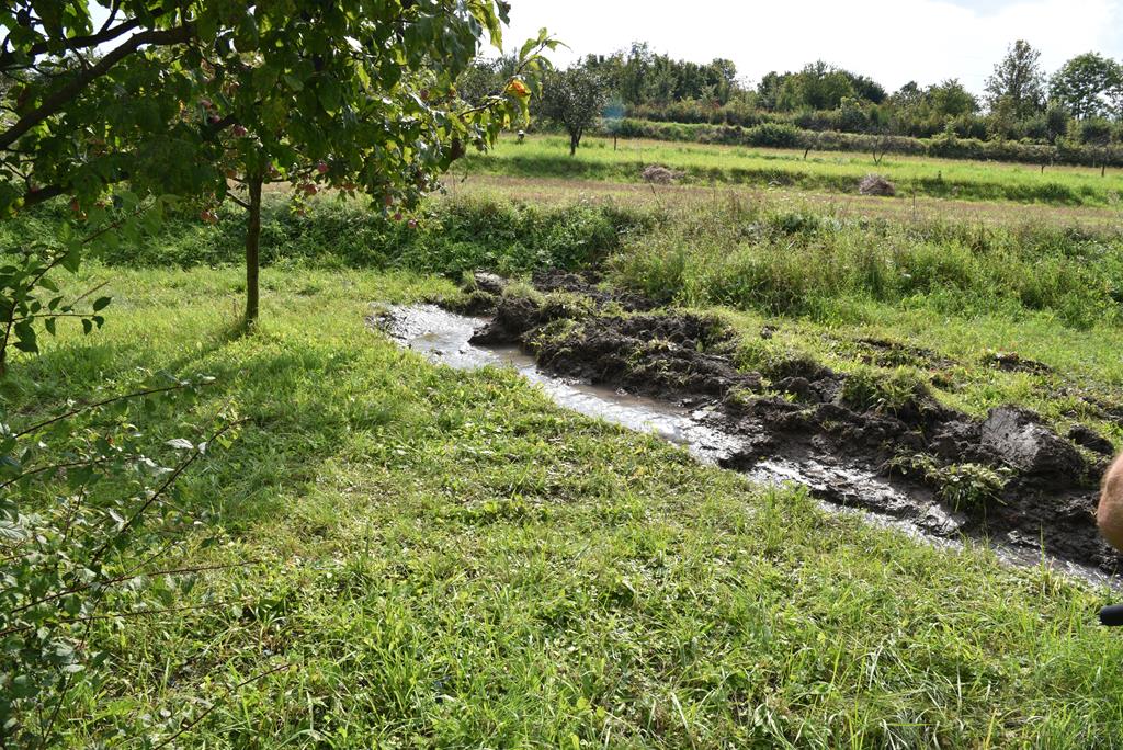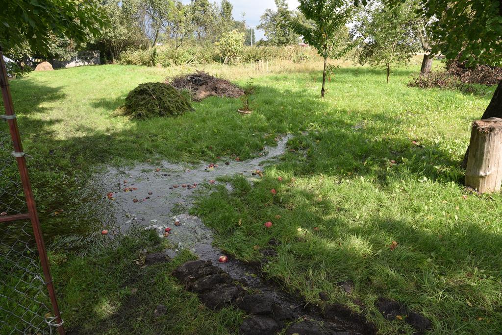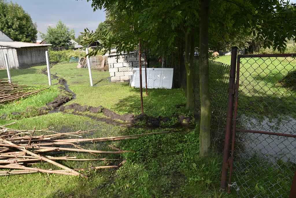 W międzyczasie – jak poinformowano nas – zdesperowani mieszkańcy własnymi siłami wykopali w ziemi prowizoryczne koryta dla tej wody, by z grubsza zapanować nad jej spływem, i zabezpieczyć przed zalewaniem i uszkodzeniami najbliżej stojący, świeżo wybudowany, nowy budynek. Dzięki temu część wody omija dopiero co zamieszkały przez młode małżeństwo z dzieckiem dom od południa i spływa wykopanym rowem po działce w kierunku drogi. Kolejne dwie odnogi strumienia przecinają zaś mały sad, woda z nich spływa przez pole nieskoszonego jęczmienia i wlewa się na sąsiednią posesję. Jej gospodarze, by ratować dom i dobytek zakupili odpowiednie rury i wykonali na szybko prowizoryczną kanalizację, która zbiera większość wody i odprowadza na ulicę, na wysokości sklepu.