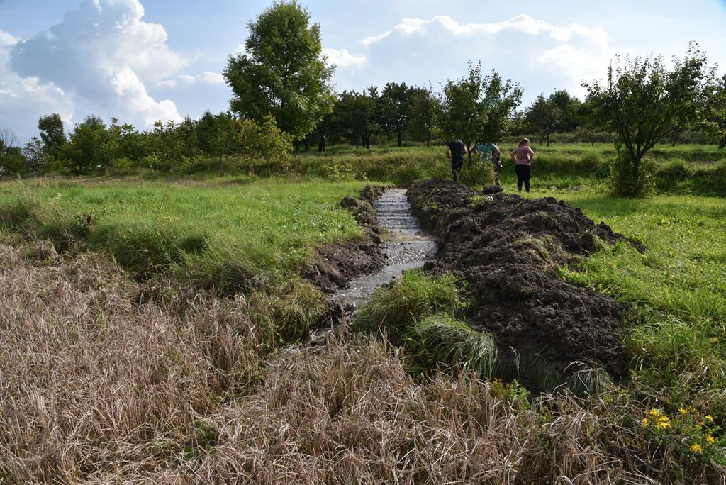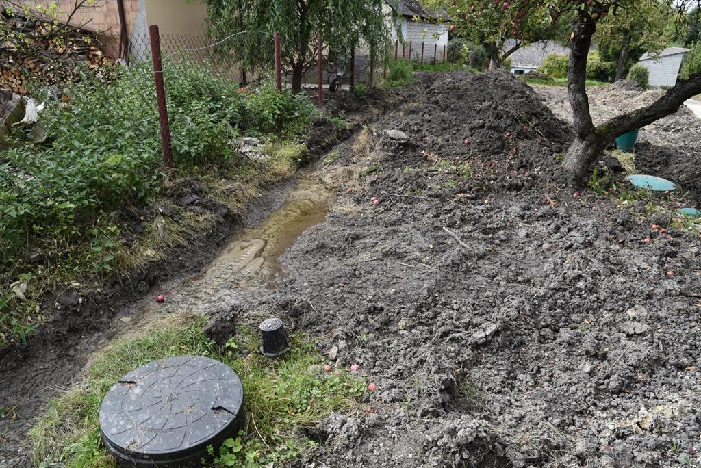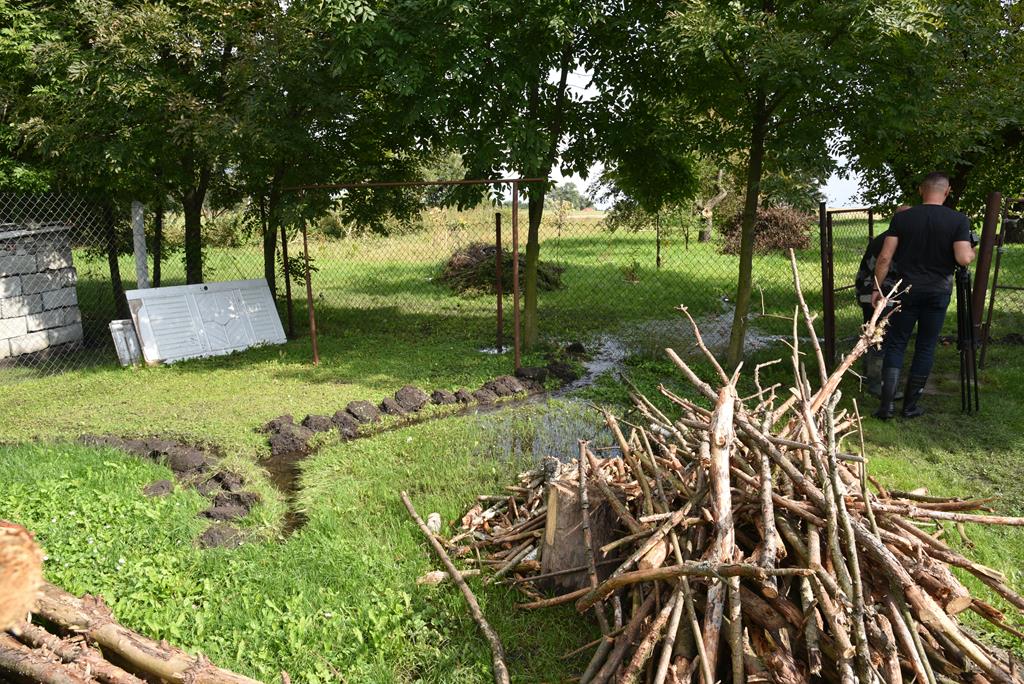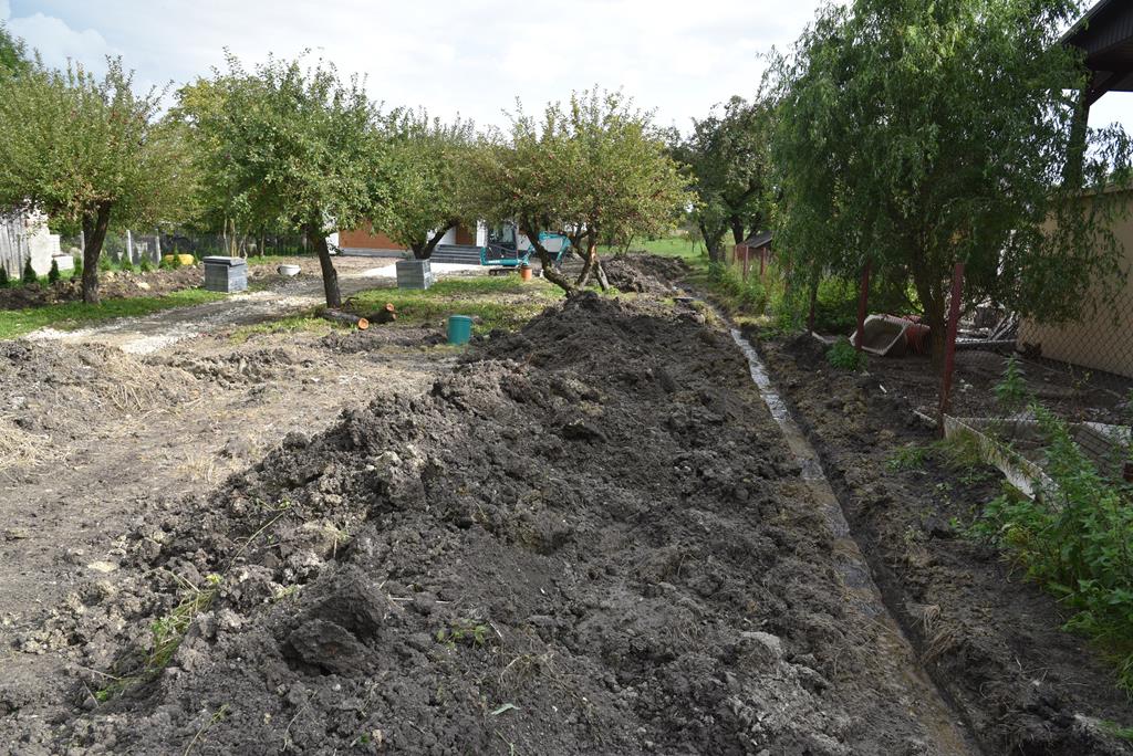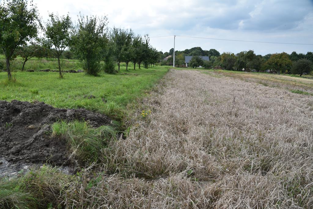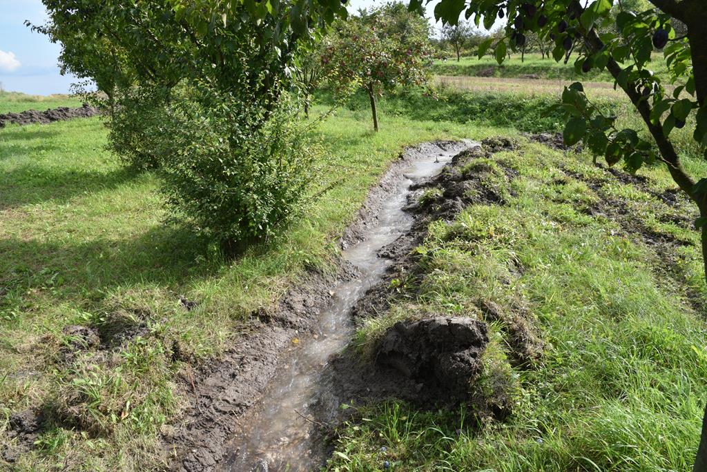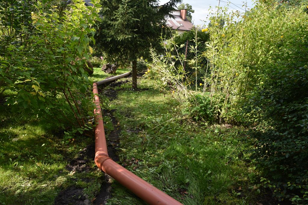 W międzyczasie – jak poinformowano nas – zdesperowani mieszkańcy własnymi siłami wykopali w ziemi prowizoryczne koryta dla tej wody, by z grubsza zapanować nad jej spływem, i zabezpieczyć przed zalewaniem i uszkodzeniami najbliżej stojący, świeżo wybudowany, nowy budynek. Dzięki temu część wody omija dopiero co zamieszkały przez młode małżeństwo z dzieckiem dom od południa i spływa wykopanym rowem po działce w kierunku drogi. Kolejne dwie odnogi strumienia przecinają zaś mały sad, woda z nich spływa przez pole nieskoszonego jęczmienia i wlewa się na sąsiednią posesję. Jej gospodarze, by ratować dom i dobytek zakupili odpowiednie rury i wykonali na szybko prowizoryczną kanalizację, która zbiera większość wody i odprowadza na ulicę, na wysokości sklepu.