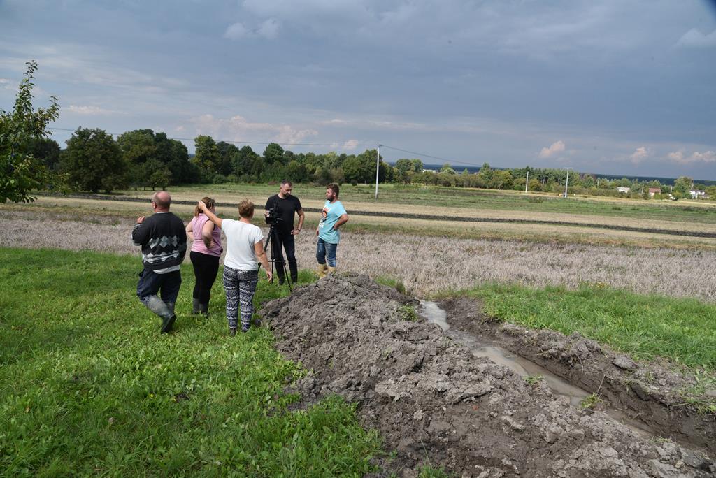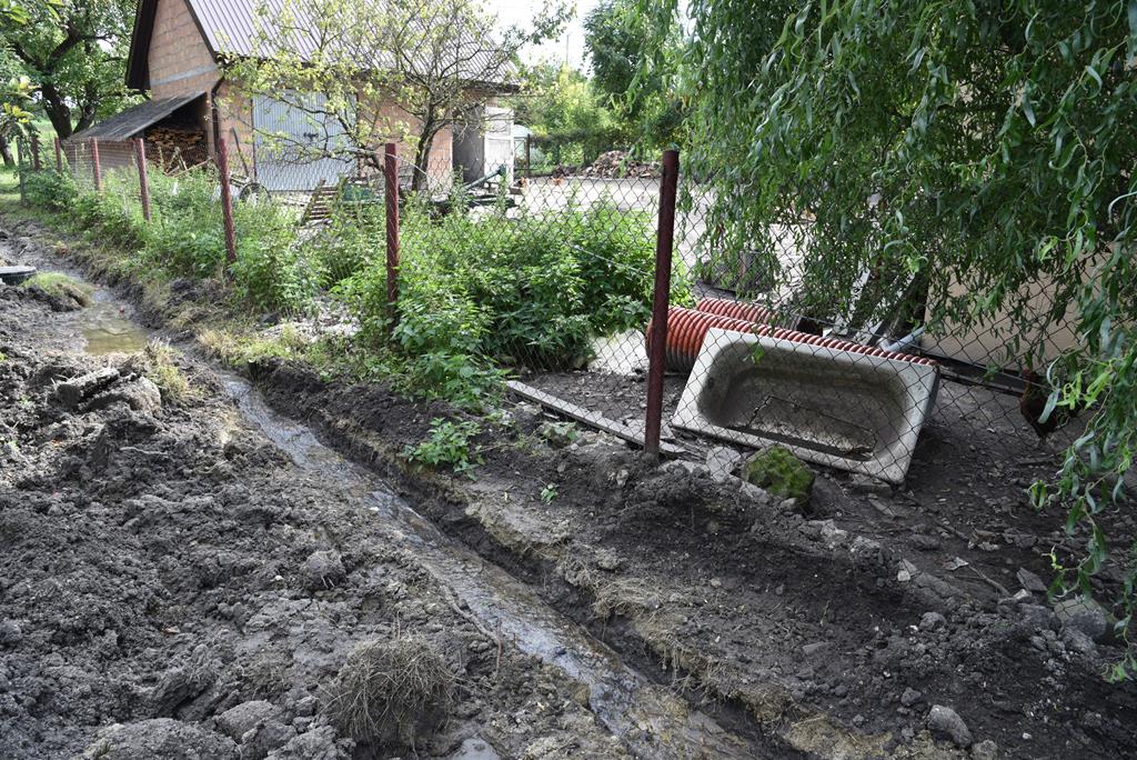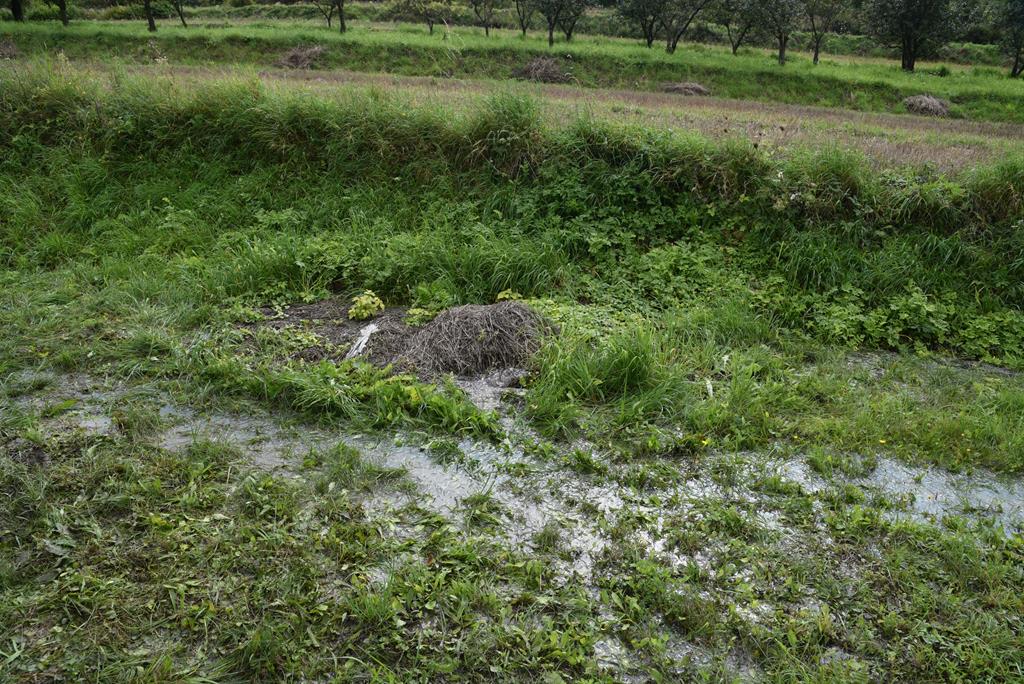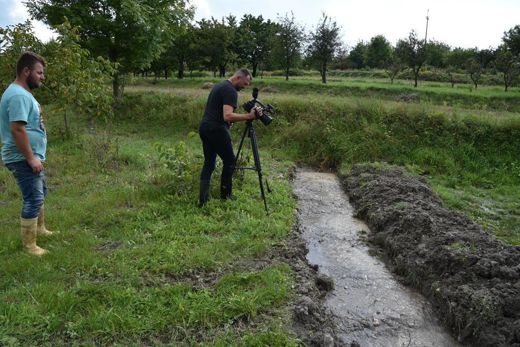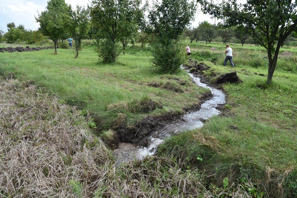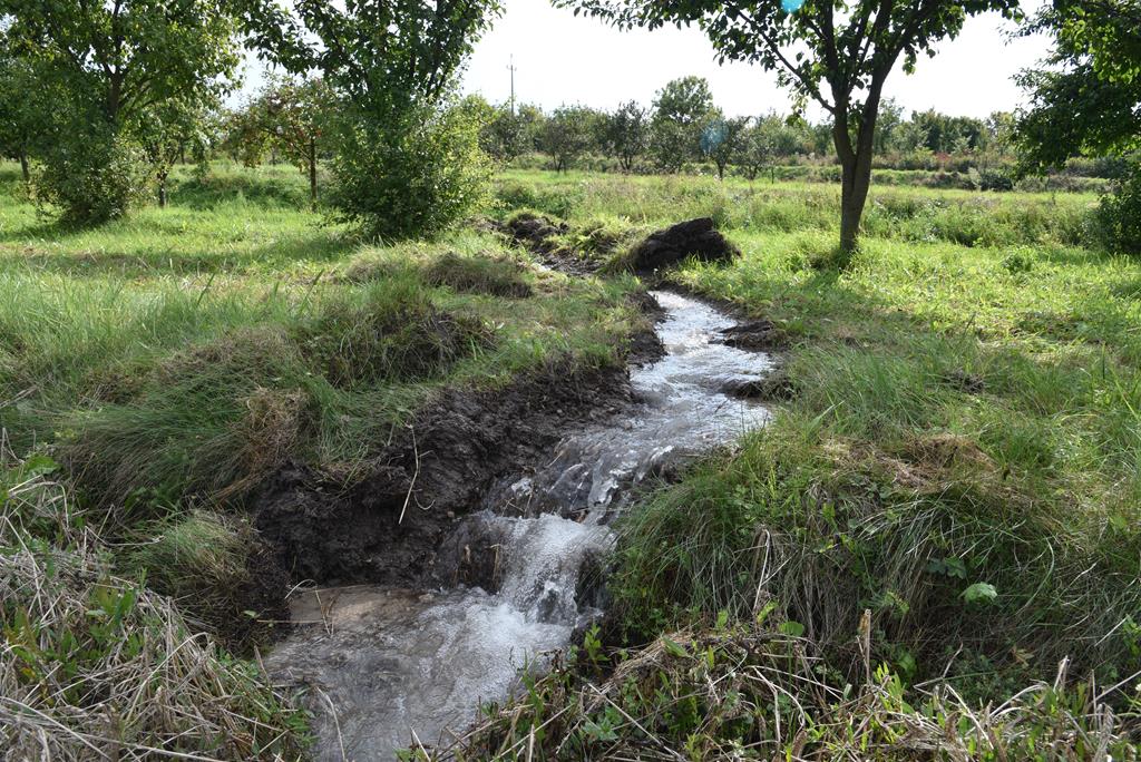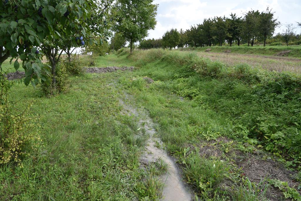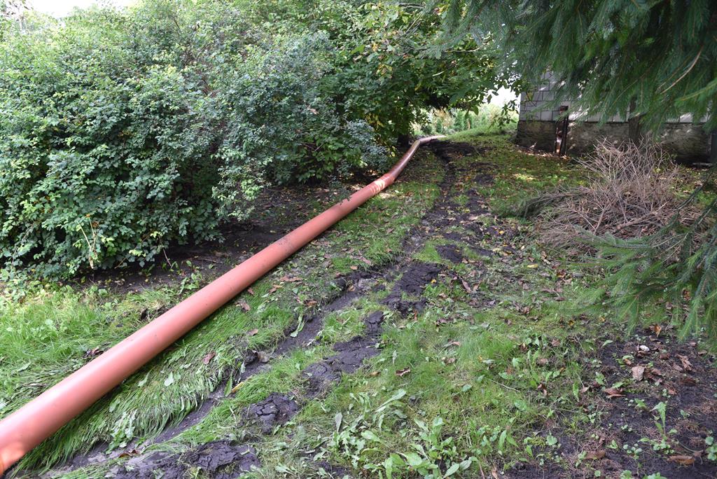 W międzyczasie – jak poinformowano nas – zdesperowani mieszkańcy własnymi siłami wykopali w ziemi prowizoryczne koryta dla tej wody, by z grubsza zapanować nad jej spływem, i zabezpieczyć przed zalewaniem i uszkodzeniami najbliżej stojący, świeżo wybudowany, nowy budynek. Dzięki temu część wody omija dopiero co zamieszkały przez młode małżeństwo z dzieckiem dom od południa i spływa wykopanym rowem po działce w kierunku drogi. Kolejne dwie odnogi strumienia przecinają zaś mały sad, woda z nich spływa przez pole nieskoszonego jęczmienia i wlewa się na sąsiednią posesję. Jej gospodarze, by ratować dom i dobytek zakupili odpowiednie rury i wykonali na szybko prowizoryczną kanalizację, która zbiera większość wody i odprowadza na ulicę, na wysokości sklepu.