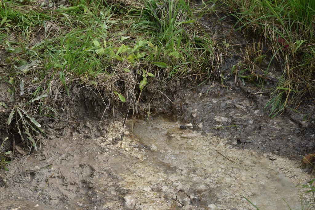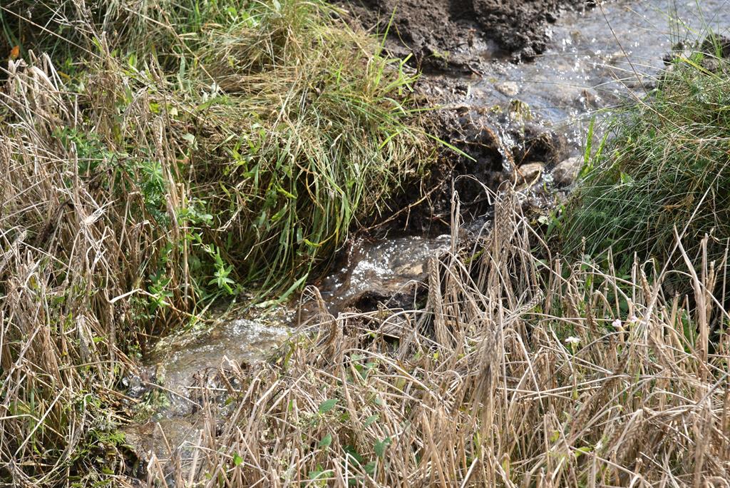 Po wstępnym rozpoznaniu, zaopatrzeni przez jednego z mieszkańców w wysokie kalosze, udaliśmy się na miejsce wypływu. Jak się okazało, z wyglądu niepozorne wywierzysko♂ znajduje się po wschodniej stronie drogi, na wzniesieniu, powyżej linii zabudowy, ok 100 metrów od sklepu♂. Tam, u podnóża skarpy/miedzy, w dwóch miejscach od kilku dni bije intensywnie spod ziemi czysta, jakby źródlana woda i spływa po nierówności w kierunku zabudowań.