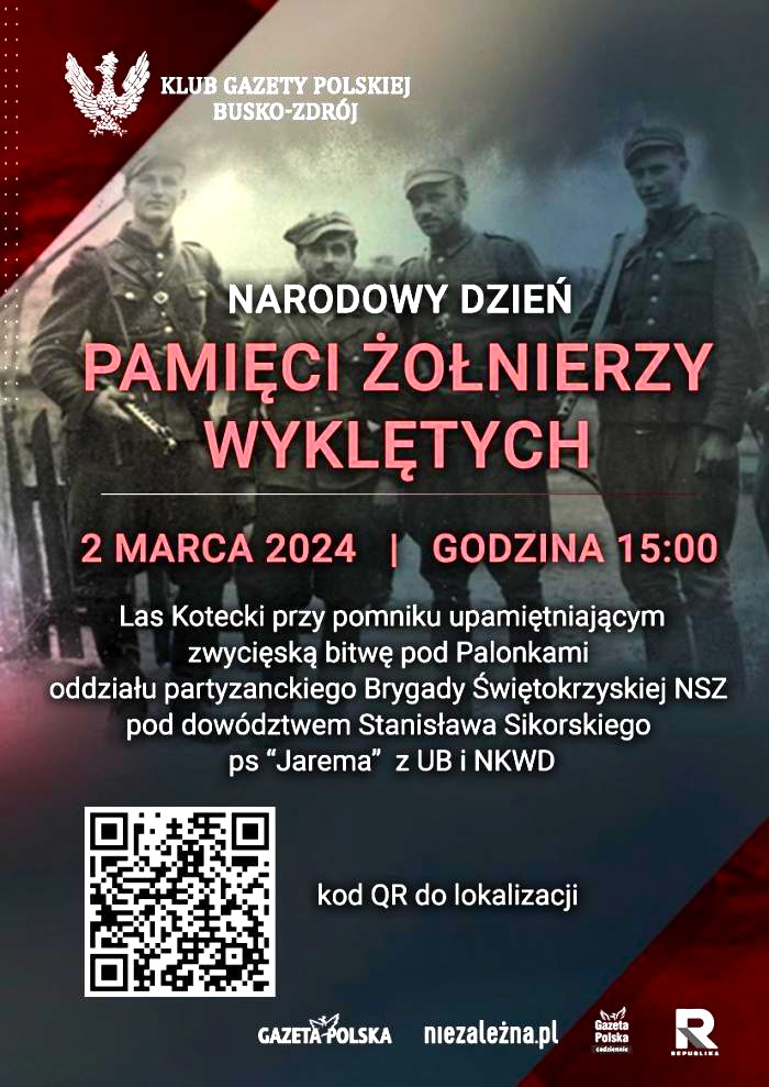 Klub Gazety Polskiej w Busku-Zdroju zaprasza w sobotę, 2 marca 2024r. o godz. 15:00 na obchody Narodowego Dnia Pamięci Żołnierzy Wyklętych w Lesie Koteckim. informuje 01.03.2024 portal busko.com.pl