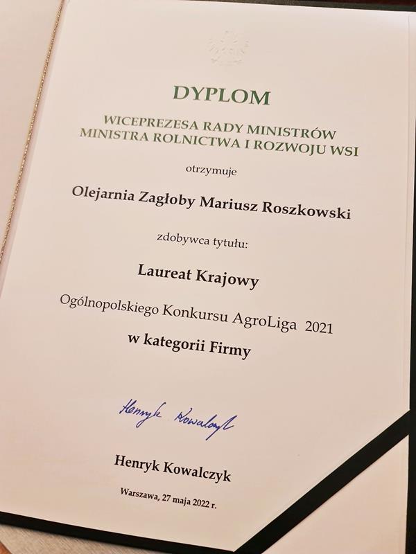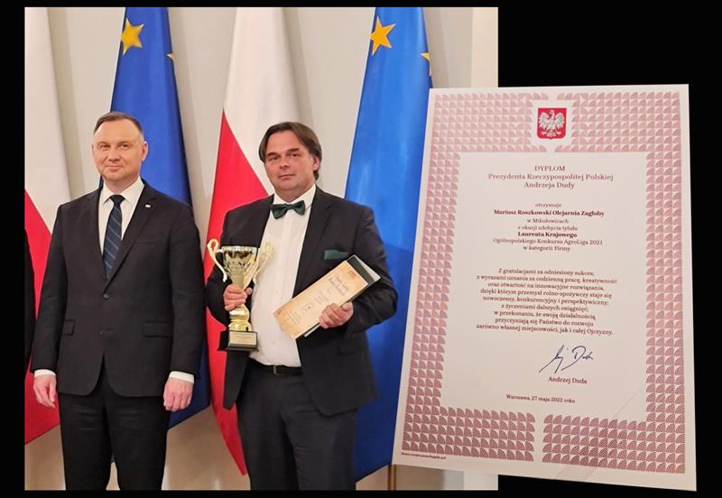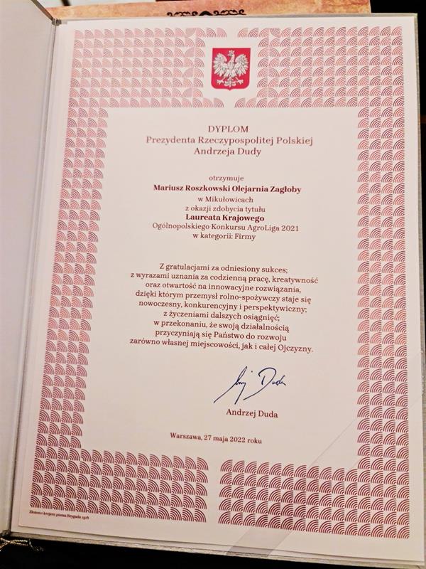 27 maja 2022r. w Pałacu Prezydenckim najlepsi rolnicy oraz przedstawiciele agrobiznesu z całego kraju zostali uhonorowani w trakcie gali podsumowującej 29 edycję konkursu AgroLiga. Podczas uroczystości Dyplom Prezydenta Rzeczypospolitej Polskiej z okazji zdobycia tytułu Laureata Krajowego w kategorii Firmy, z rąk Prezydenta Andrzeja Dudy odebrał Mariusz Roszkowski, Olejarnia Zagłoby z podbuskich Mikułowic!