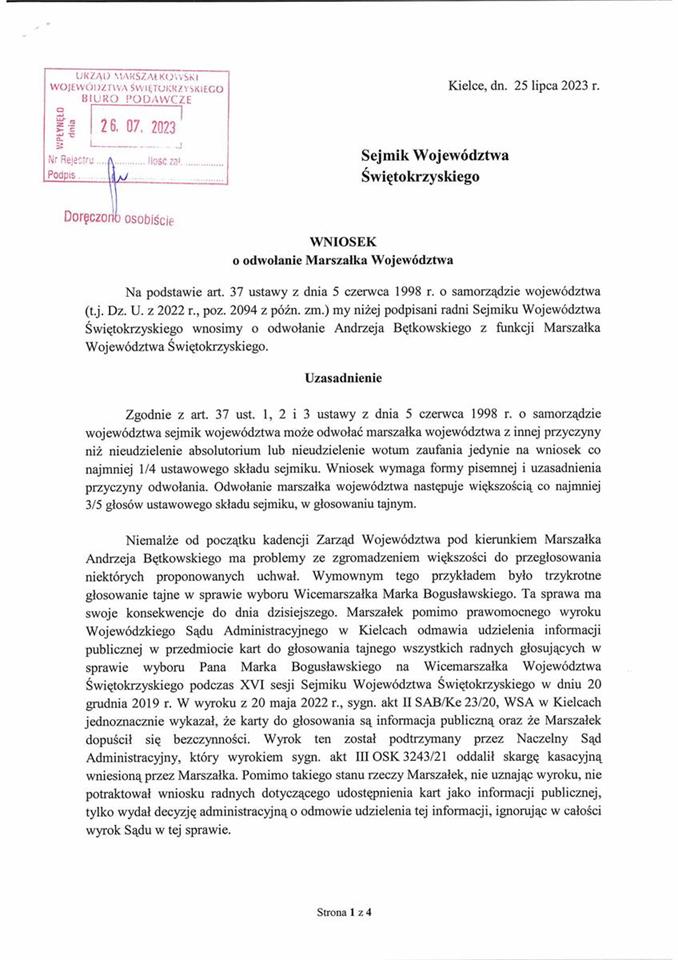 Niemalże od początku kadencji Zarząd Województwa pod kierunkiem Marszałka Andrzeja Bętkowskiego’ ma problemy ze zgromadzeniem większości do przegłosowania niektórych proponowanych uchwał. Wymownym tego przykładem było trzykrotne głosowanie tajne w sprawie wyboru wicemarszałka Marka Bogusławskiego” – czytamy we wstępie wniosku. Grupa radnych złożyła go w Urzędzie Marszałkowskim Województwa Świętokrzyskiego w środę, 26.07.2023, po południu.