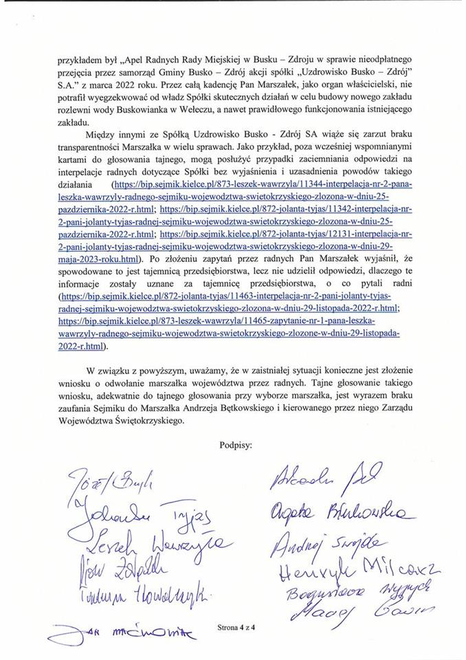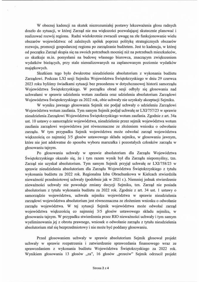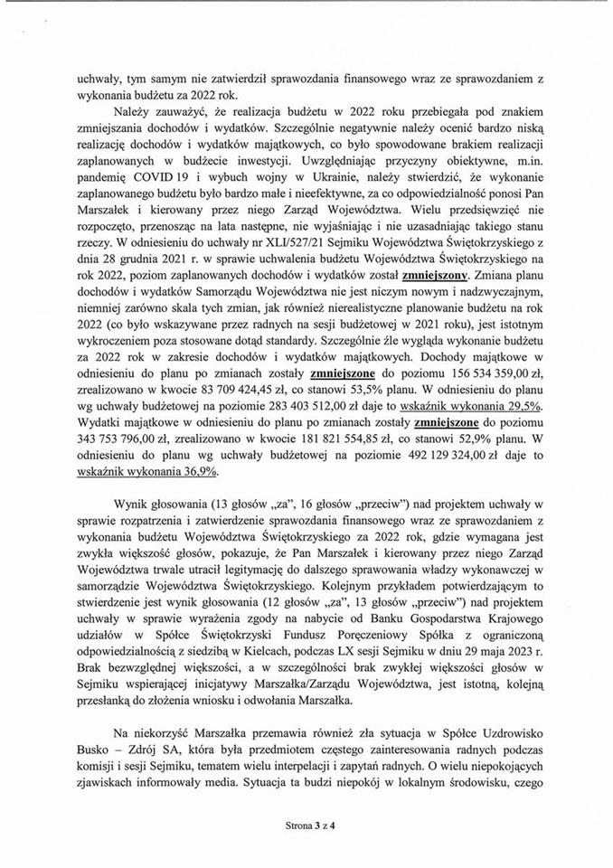 „Grupa radnych (w tym radni z Klub Radnych PSL Świętokrzyskie) złożyła wniosek o odwołanie Marszałka Województwa Świętokrzyskiego.
