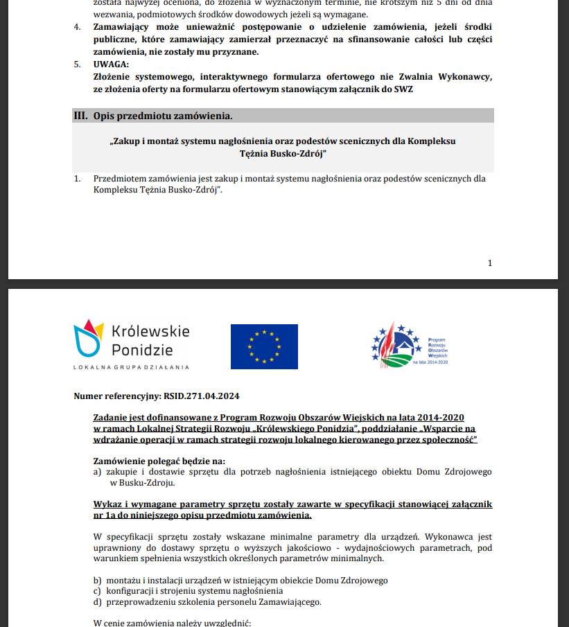 „Uwaga mieszkańcy sołectw! Pragnę zwrócić uwagę na jeszcze dwie rzeczy, a dokładnie na dwa przetargi. Pierwszy z nich: ” Zakup i montaż systemu nagłośnienia oraz podestów scenicznych dla Kompleksu Tężnia Busko-Zdrój ” , a drugi to: ”Zakup i montaż ekranu LED wraz z wykonaniem kompletnego okablowania do Domu Zdrojowego oraz obiektu przestrzennej ramy do zdjęć pamiątkowych w Busku-Zdroju”. Obie te inwestycje są dofinansowane z… programu rozwoju obszarów wiejskich!!!”