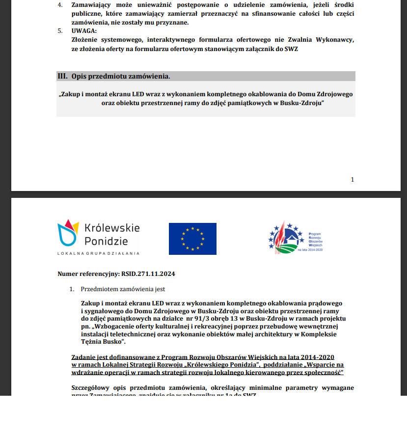 Możecie sprawdzić to sami na stronie UMIG. Poniżej macie linki do przetargów. Trzeba wejść w dany przetarg, a następnie wejść w SWZ (specyfikacja warunków zamówienia) i tam jest napisane: „Zadanie jest dofinansowane z Program Rozwoju Obszarów Wiejskich na lata 2014-2020 w ramach Lokalnej Strategii Rozwoju „Królewskiego Ponidzia”, poddziałanie „Wsparcie na wdrażanie operacji w ramach strategii rozwoju lokalnego kierowanego przez społeczność.”