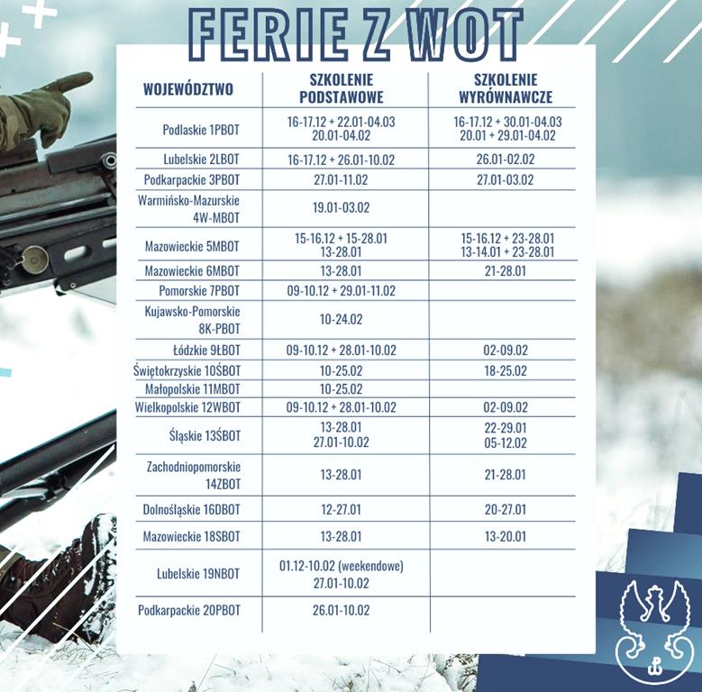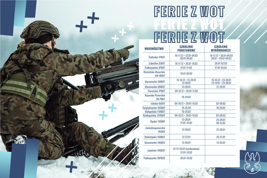 Projekt „Ferie z WOT” powstał w 2019 roku i od tego czasu z możliwości odbycia szkolenia podstawowego na przełomie stycznia i lutego skorzystało wielu ochotników. W tym roku „Ferie z WOT” będą prowadzone we wszystkich Brygadach OT rozmieszczonych na terenie całego kraju. Większość jednostek szkolenie podstawowe przeprowadzi na terenie działania brygad, blisko lokalnych społeczności lub na pobliskich ośrodkach szkolenia poligonowego. Powołania do jednostek wojskowych WOT będą się odbywać zgodnie z ogólnopolskim harmonogramem ferii w poszczególnych województwach. Każde ze szkoleń zakończy tradycyjna przysięga wojskowa.
