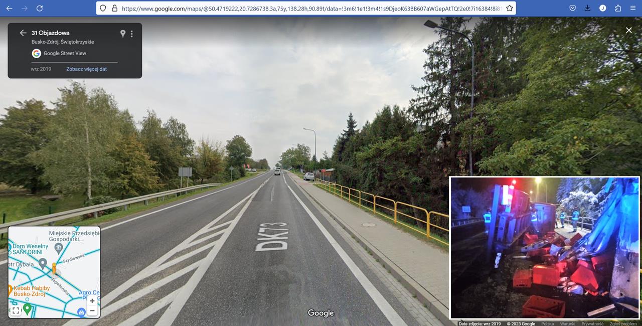 ○ Busko-Zdrój, 20.01.2023: Kolejny groźny wypadek na ul. Objazdowej. Opodal skrzyżowania z ul. Łagiewnicką wywrócona ciężarowa SCANIA z izotermą, mięso na drodze. 8 zastępów straży pożarnej w akcji. / źródło: g’mapa♂