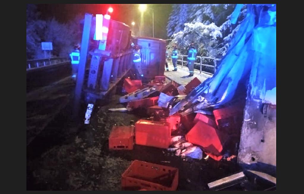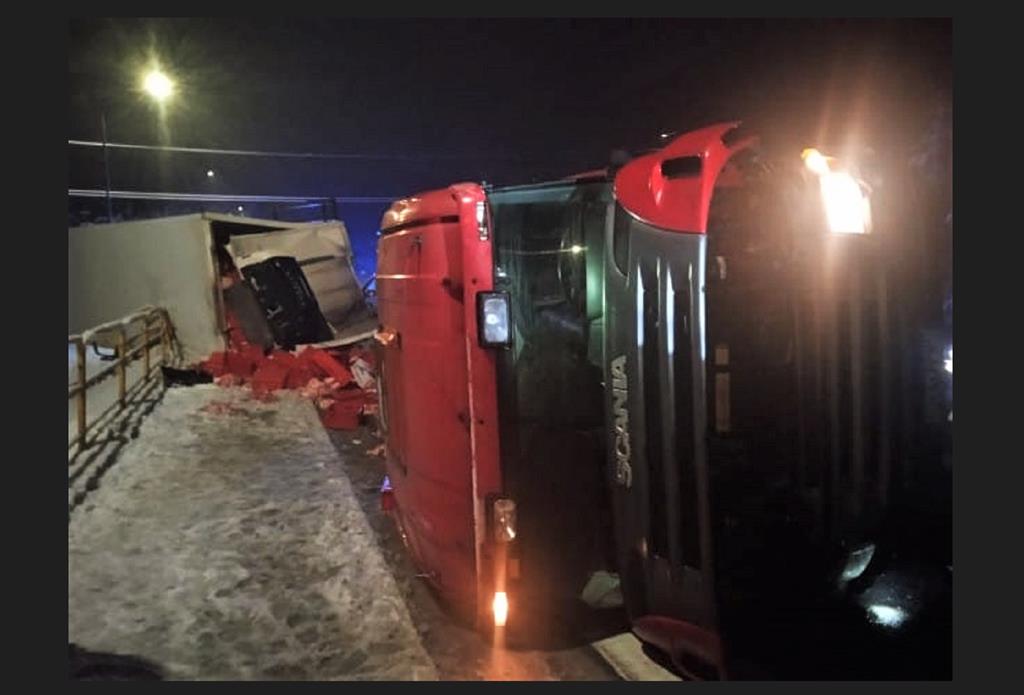 ○ Busko-Zdrój, 20.01.2023: Kolejny groźny wypadek na ul. Objazdowej. Opodal skrzyżowania z ul. Łagiewnicką wywrócona ciężarowa SCANIA z izotermą, mięso na drodze. 8 zastępów straży pożarnej w akcji. / fot. KP PSP Busko-Zdrój♂