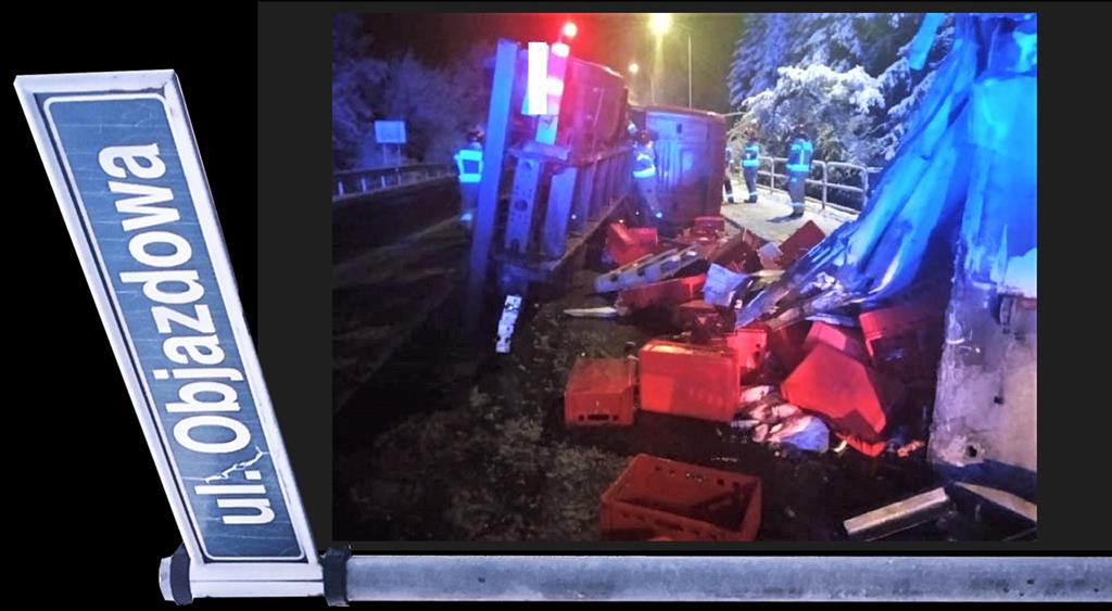 🟥 Kolejny groźny wypadek na ul. Objazdowej w Busku-Zdroju. Ciężarowa SCANIA z izotermą wywrócona, mięso na drodze. 8 zastępów straży pożarnej w akcji