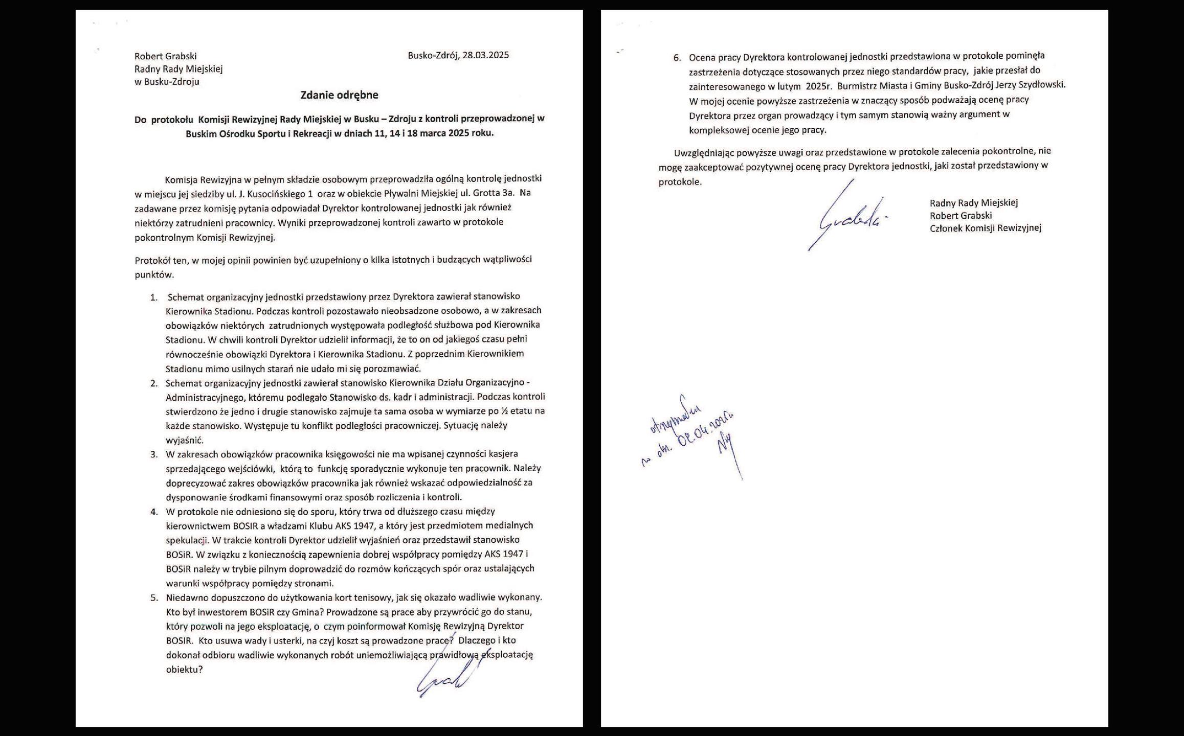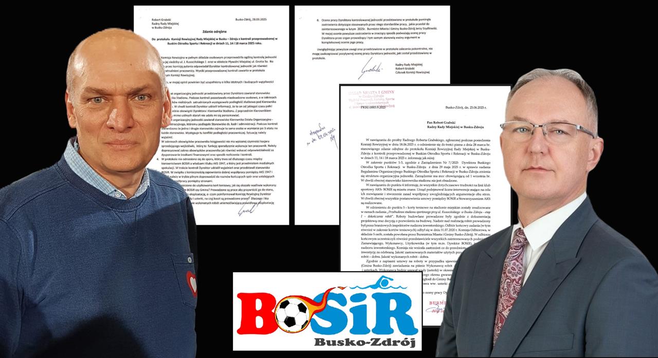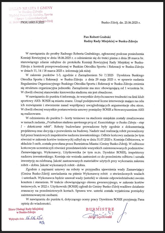 Szanowni mieszkańcy, otrzymałem odpowiedź Burmistrza Jerzego Szydłowskiego na moje zdanie odrębne zgłoszone do protokołu z kontroli BOSiR, która odbyła się w marcu 2025r. Zachęcam do zapoznania się z moim pismem (iB: sporządzonym w dniu 28.03.2025 ) i odpowiedzią Pana Burmistrza (iB: datowaną na dzień 25.06.2025). Proszę o komentowanie. Zapraszam również do słuchania 4-go odcinka YT „Rozmów lokalnych” dotyczącego tej sprawy. informuje 21.07.2025 na fb’profilu Robert Tomasz Grabski radny Rady Miejskiej w Busku-Zdroju