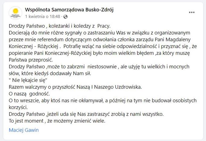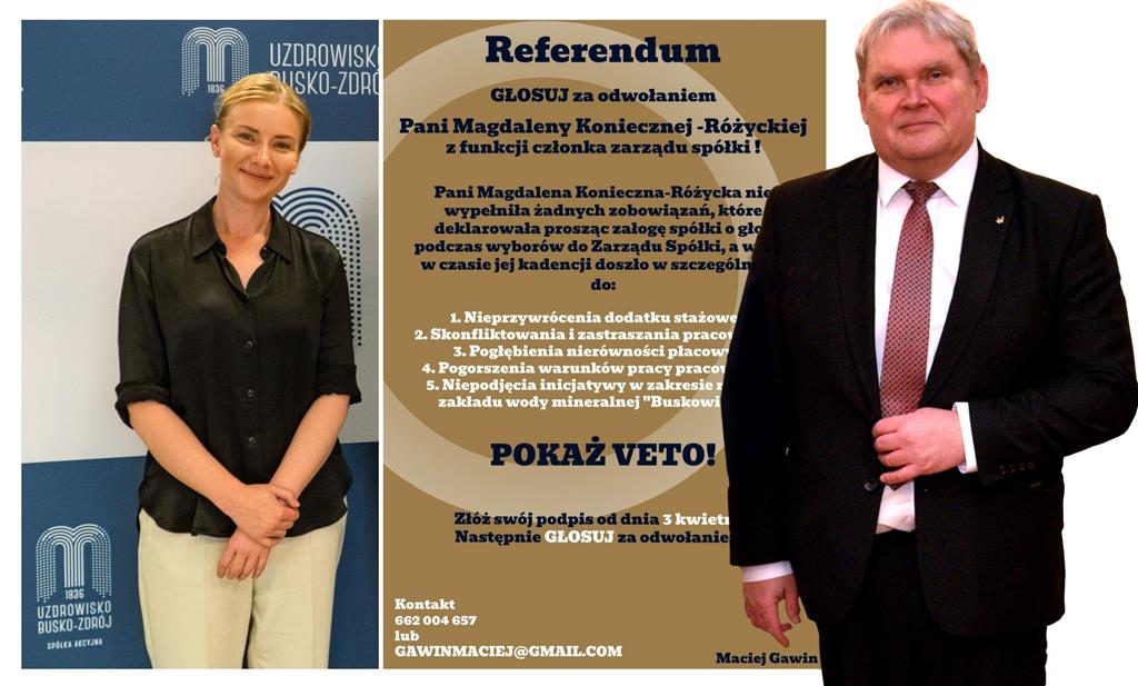 ? „POKAŻ VETO!” Referendum w sprawie odwołania członka Zarządu Uzdrowiska Busko-Zdrój S.A. Czy Maciejowi Gawinowi uda się odwołać Magdalenę Konieczną-Różycką?