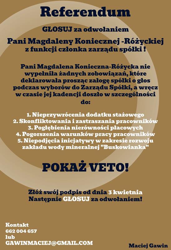 Wciąż nie wiadomo, czy i kiedy dojdzie do referendum w sprawie odwołania z funkcji członkini zarządu Uzdrowiska Busko-Zdrój. Podpisy wprawdzie są, ale do rady nadzorczej wpłynęły niepokojące sygnały w tej kwestii. – informuje 19.06.2023 portal kielce.wyborcza.pl