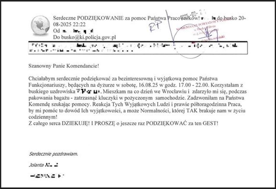 – Szanowny Panie Komendancie! Chciałabym serdecznie podziękować za bezinteresowną i wyjątkową pomoc Państwa Funkcjonariuszy… – pisze 20.08.2025 na wstępie e-listu przesłanego do KPP Busko-Zdrój’ Pani Jolanta, wdzięczna za udzieloną jej pomoc kuracjuszka z Wrocławia