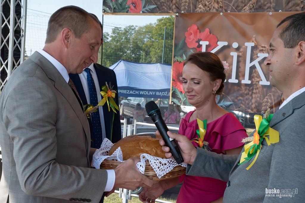 Następnie barwny korowód dożynkowy przeszedł na plac przy szkole. Gospodarze uroczystości powitali przybyłych gości, a starostowie przekazali na ręce Wójta Piotra Kality gminy chleb dożynkowy, którym następnie podzielono się z uczestnikami. Nie zabrakło również tradycyjnych wieńców dożynkowych, symbolizujących plon i pracę rolników.