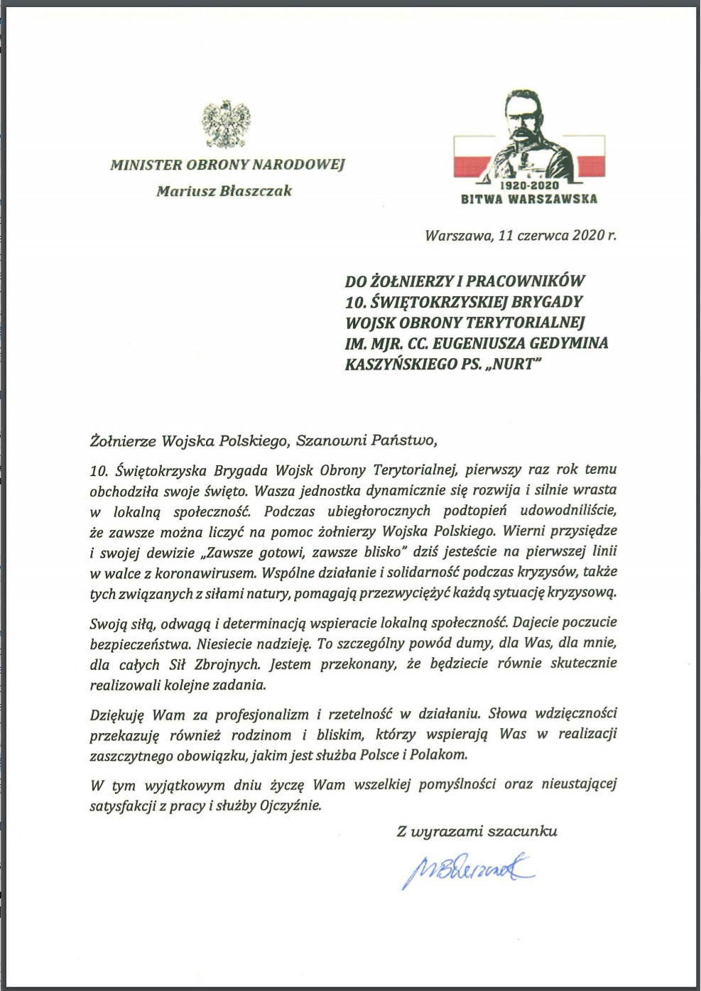 W dniu święta 10 ŚBOT Minister Obrony Narodowej Mariusz Błaszczak skierował list z życzeniami dla żołnierzy oraz pracowników brygady.