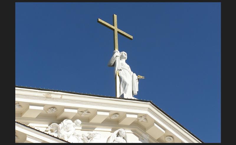 ○ Święta Helena z Krzyżem – figura na fasadzie Bazyliki archikatedralnej św. Stanisława Biskupa i św. Władysława w Wilnie♂ / autor: Krzysztof Mizera, Wikipedia♂