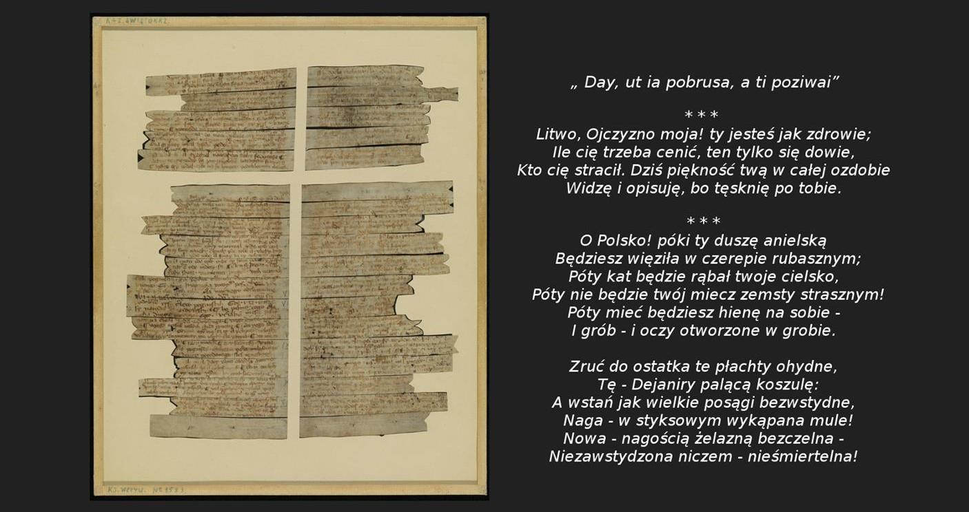 – Pan Tadeusz, inwokacja, pierwsze strofy poematu.