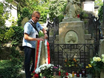 ○ Grób Fryderyka Chopina’ z rzeźba przedstawiająca muzę poezji lirycznej Euterpe, pochyloną nad złamaną lirą, cmentarz Père-Lachaise w Paryżu. Na grobie można zobaczyć liczne polskie flagi i hołdy. / autor: Paul Louis ; Wikipedia♂