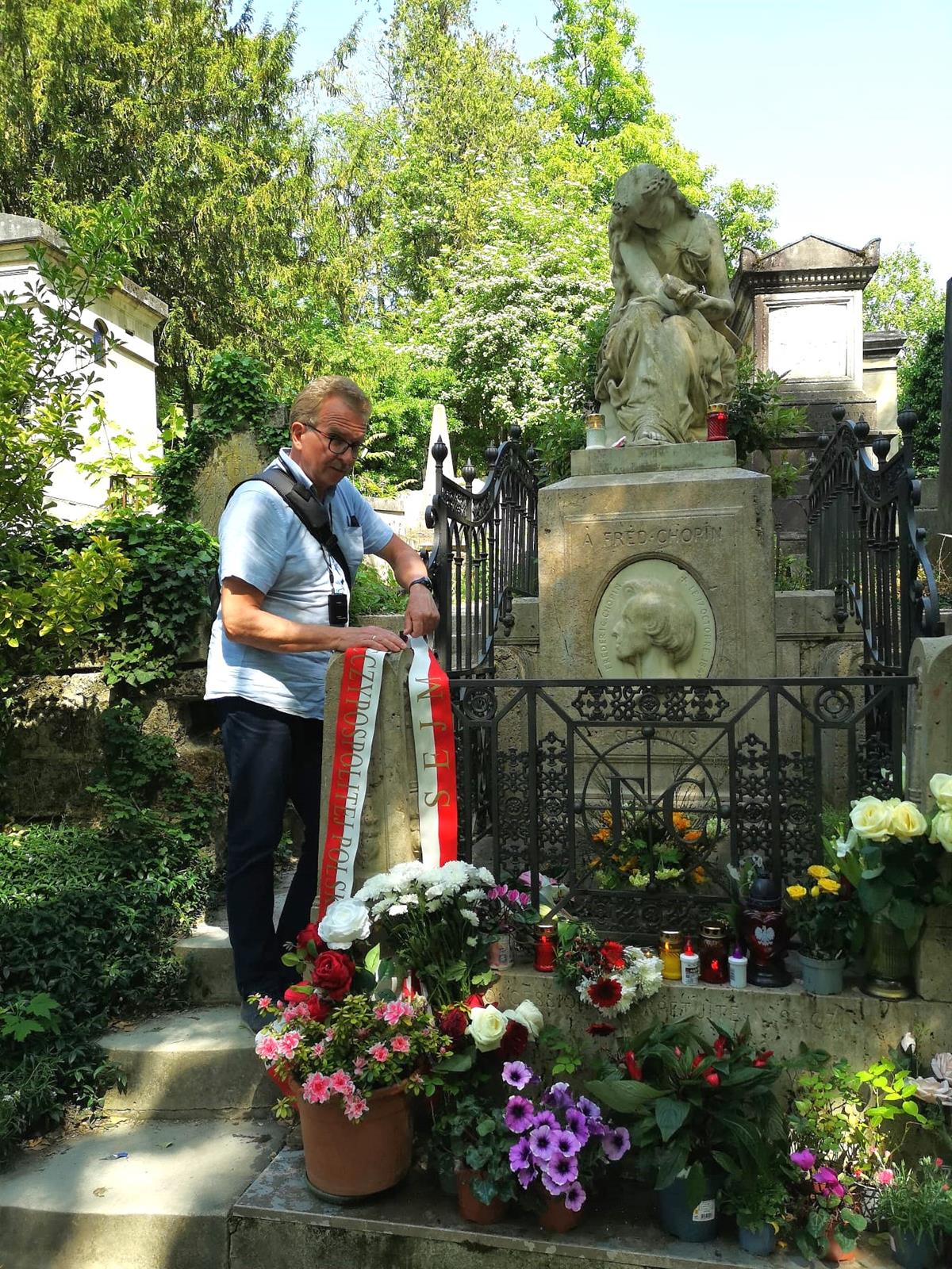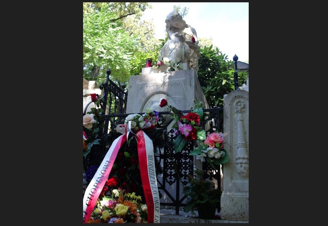○ Grób Fryderyka Chopina’ z rzeźba przedstawiająca muzę poezji lirycznej Euterpe, pochyloną nad złamaną lirą, cmentarz Père-Lachaise w Paryżu. Na grobie można zobaczyć liczne polskie flagi i hołdy. / autor: Paul Louis ; Wikipedia♂