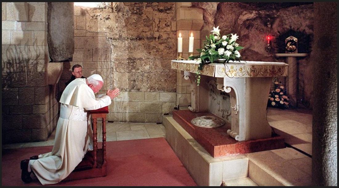 Nazaret, 26.03.2000. Papież Jan Paweł II modli się w Bazylice Zwiastowania w Nazarecie, w miejscu gdzie Archanioł Gabriel zwiastował Maryi, że pocznie i urodzi Syna Bożego. / Autor – PAP/EPA (ARTURO MARI) / źródło: PR Jedynka♂