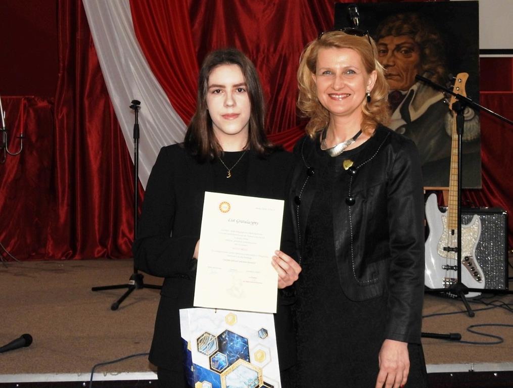 Podczas uroczystego zakończenia roku szkolnego dla klas czwartych I Liceum Ogólnokształcącego im. T. Kościuszki w Busku-Zdroju dnia 28.04.2023 r. uczennica otrzymała gratulacje i podziękowania od Dyrekcji Szkoły i Rady Rodziców.