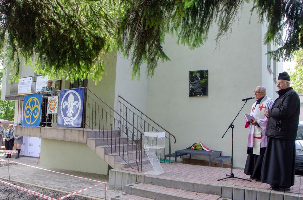 Następnie ksiądz dziekan Marek Podyma i proboszcz ks. Marian Janik poświęcili tablicę i budynek Domu Harcerza.