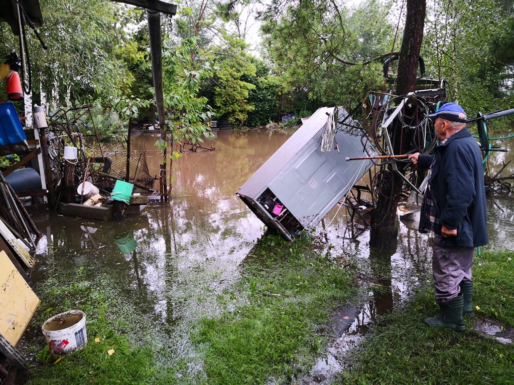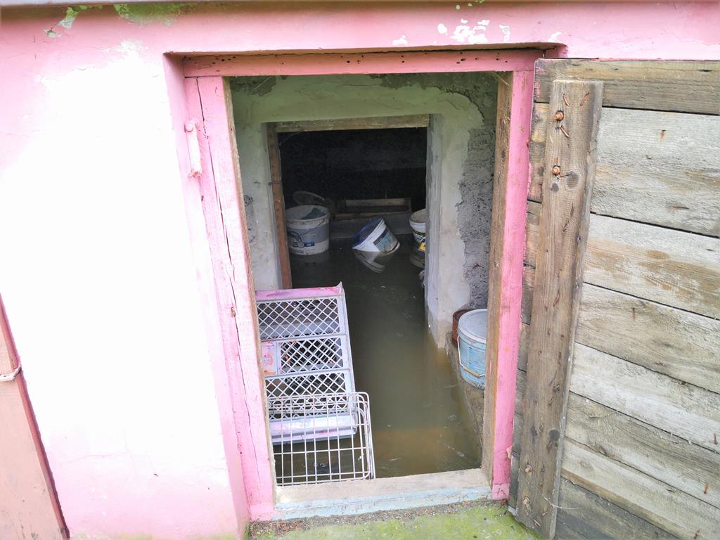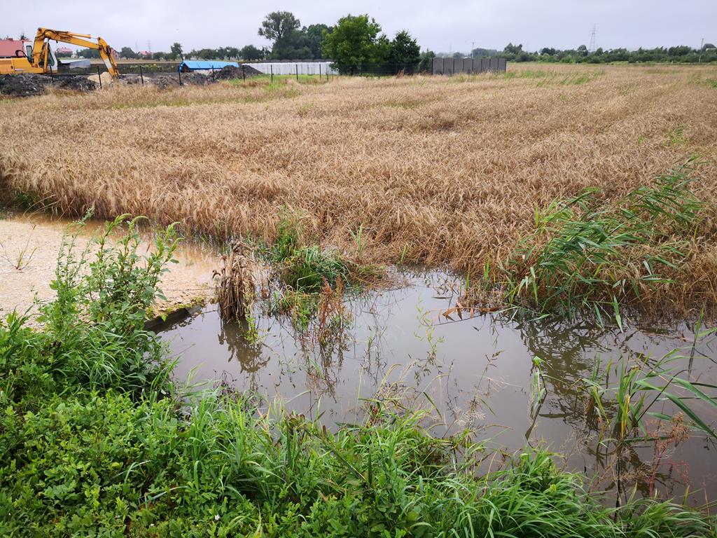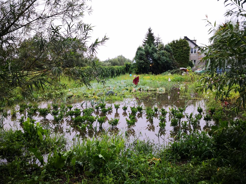 Chotelek k. Buska-Zdroju: w sąsiedztwie przepustu pod drogą nad Maskalisem wezbrana woda zalała pola i budynki. Zatopiła również lokalną przepompownię ścieków(fot.8) ♂, 6 siepnia 2021 r., g.11:00