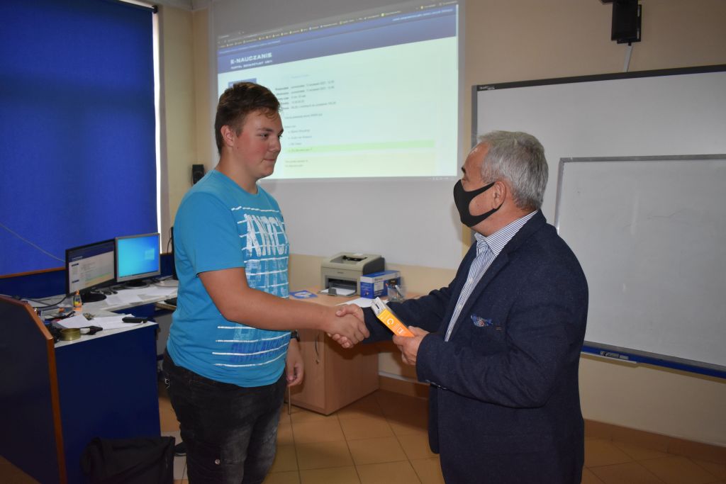Konkurs został przeprowadzony na naszej szkolnej platformie Moodle. Składał się z 30 pytań zamkniętych. Najlepszy wynik uzyskał uczeń klasy 1n Wojciech Dusza – w nagrodę z rąk Pana Dyrektora Sylwestra Pałki otrzymał dysk przenośny 1TB. Każdy z uczestników otrzymał nagrodę niespodziankę w postaci Pendrive 32GB.