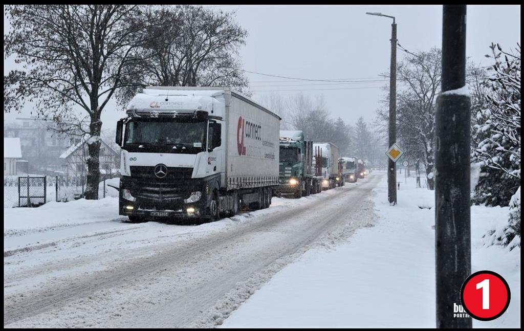 Uwaga utrudnienia w ruchu! Rondo na skrzyżowaniu ulic Witosa i Waryńskiego w Busku-Zdroju jest zablokowane przez tiry. Intensywne opady śniegu spowodowały utrudnienia na drogach. W wielu miejscach jest ślisko i są duże problemy z jazdą nie tylko dla kierowców samochodów ciężarowych. Apelujemy o ostrożną jazdę! – alarmuje 12.12.2022 portal busko.com.pl