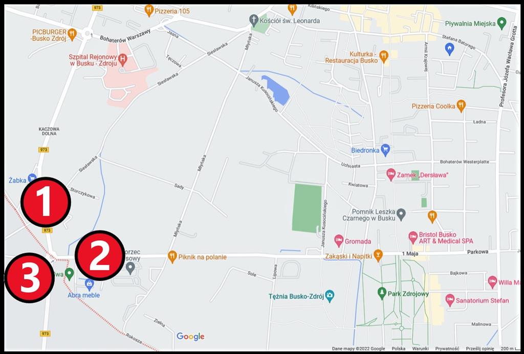 ○ Busko-Zdrój, 12.12.2022: Rondo [3] na skrzyżowaniu ulic Witosa [1] i Waryńskiego [2] w Busku-Zdroju jest zablokowane przez tiry / fot. busko.com.pl ♂ | google.maps.com♂