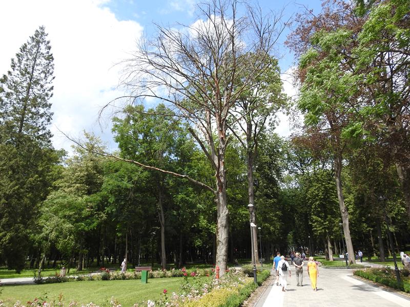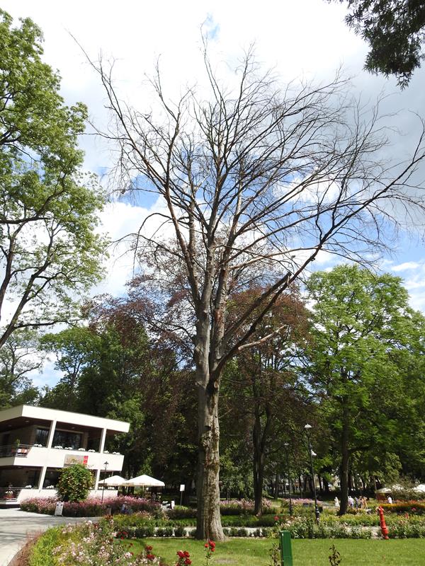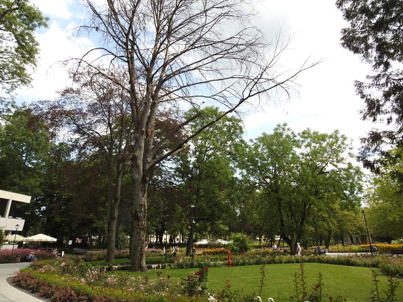 Niestety, smutne jest to, że przy każdej kolejnej wizycie w centralnej części zabytkowego, liczącego ponad 100 lat, Parku Zdrojowego, dostrzegam kolejne, wymowne symptomy tego, że dostojne drzewa rosnące tam od ponad wieku w ostatnim czasie zaczęły w mojej ocenie masowo marnieć… Zwłaszcza te podświetlone i stojące blisko zrewitalizowanych betonowych alejek. Najwspanialszy do niedawna okaz buka czerwonego jest już trupem, co widać na zdjęciach… Dni rosnącego obok niego, przez alejkę, buka bliźniaka, są już też raczej policzone…