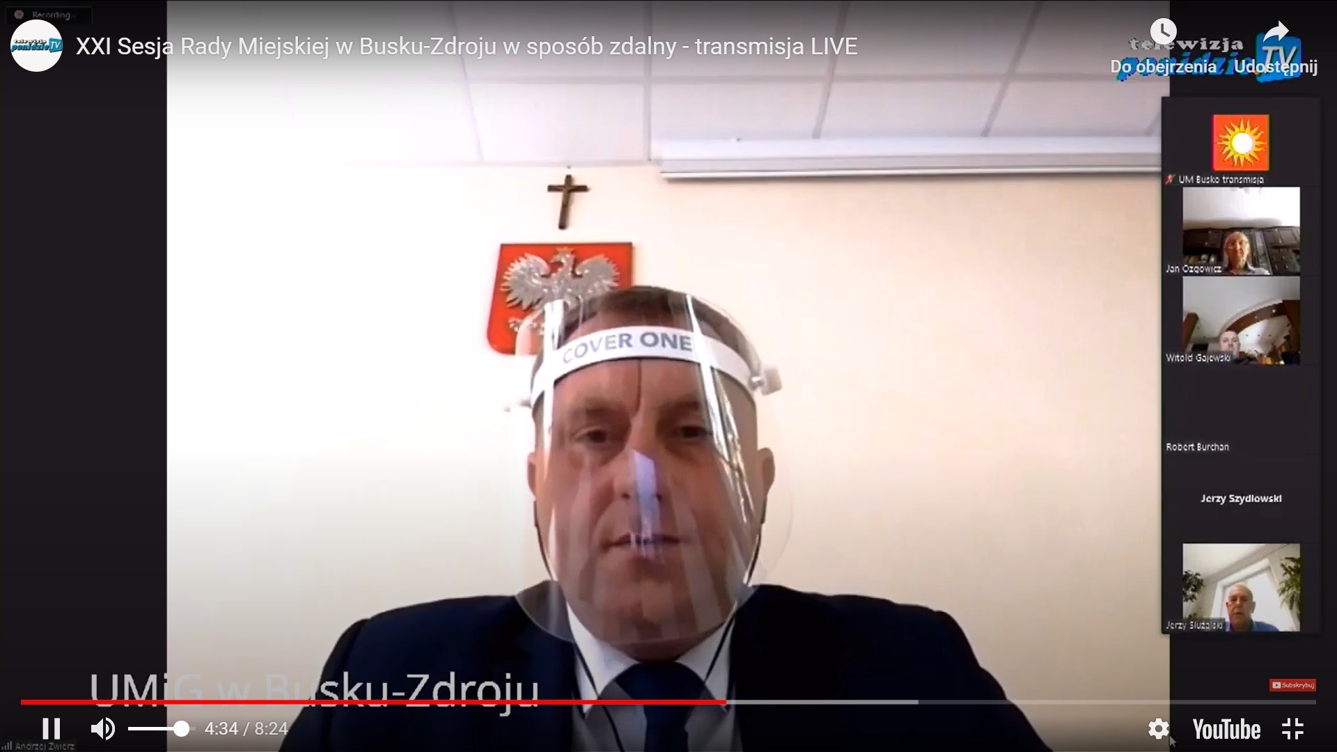Przewodniczący Rady Miejskiej w Busku-Zdroju Robert Burchan, 21.05.2020 / screen z @relacji XXI Sesji Rady Miejskiej w Busku-Zdroju