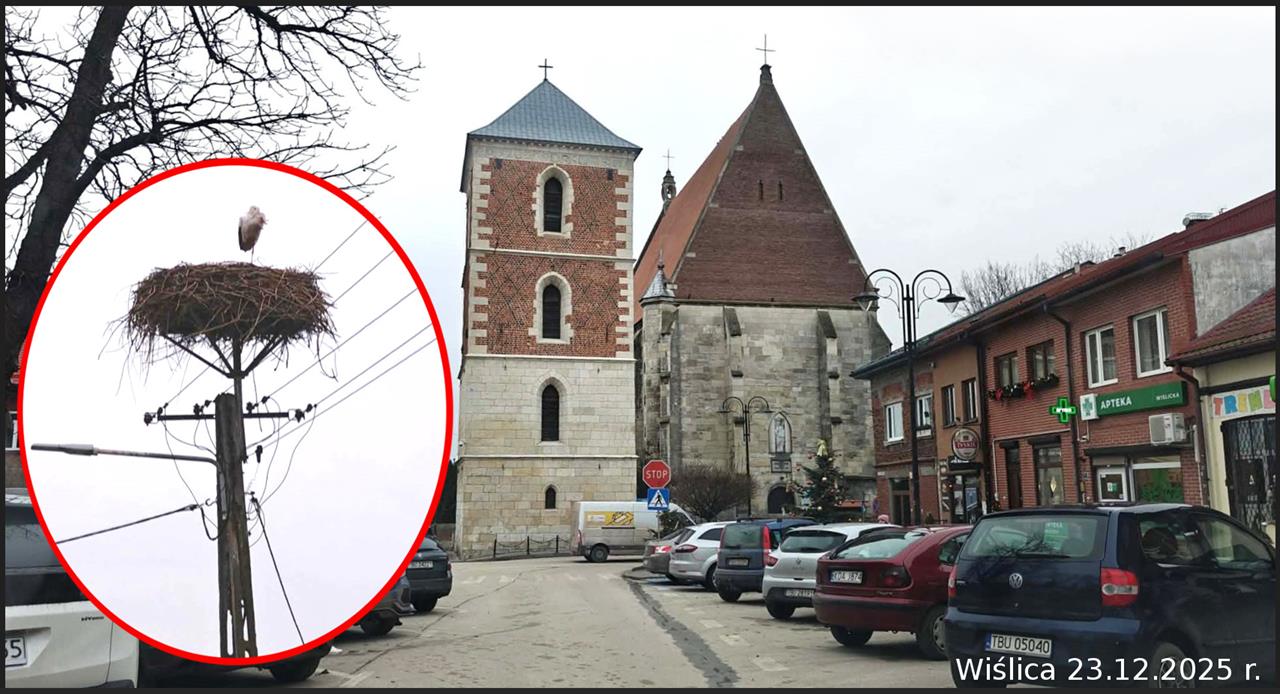 Od kilku tygodni uwagę mieszkańców Wiślicy oraz gości odwiedzających ten królewski gród nad Nidą przyciąga niecodzienny widok. To pewien bocian, który nie odleciał na zimę i pozostał na swoim gnieździe nieopodal ufundowanej przez króla Kazimierza Wielkiego bazyliki, podczas gdy jego rodzina i kuzyni już dawno wyruszyli do ciepłych krajów. Jego losem zainteresowali się Maryla i Grzegorz Kamińscy oraz sąsiedzi, którzy postanowili otoczyć ptaka opieką. – informuje 31.12.2025 prtal Radio Kielce