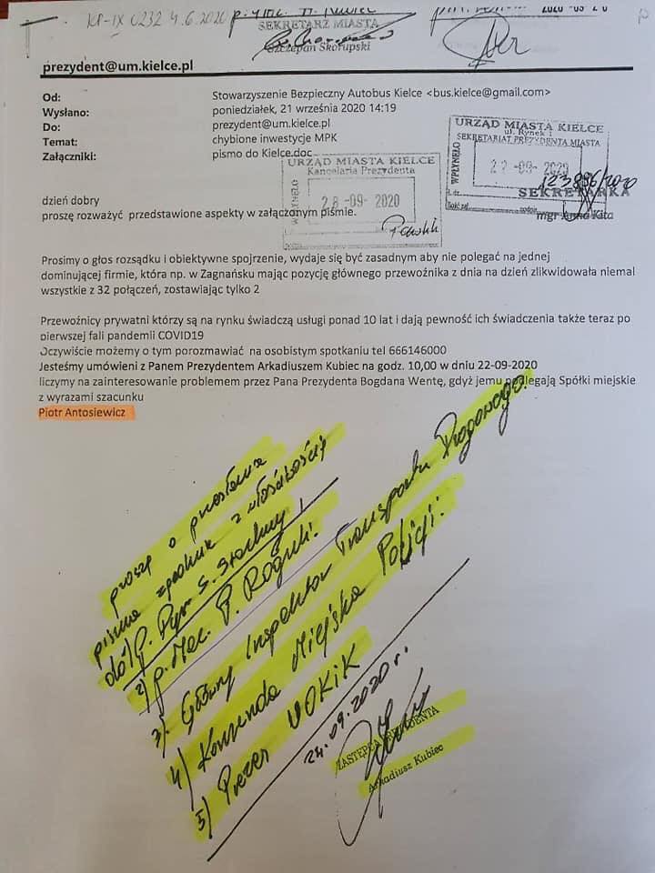 Poniżej przestawiamy jeden z licznych paszkwili napisanych na MPK i bezpośrednio na mnie, rozsyłanych od kilku miesięcy do różnych instytucji państwowych i samorządowych. Proszę zwrócić uwagę, czyje sugestie, żeby nie powiedzieć polecenia, wykonuje Pan wiceprezydent Kubiec i z jaką determinacją przekierowuje pisma zawiadamiając różne instytucje, brakuje tylko CBA, CBŚP, no i chyba kontrwywiadu wojskowego, gdyż działalność MPK zagraża chyba suwerenności kraju.