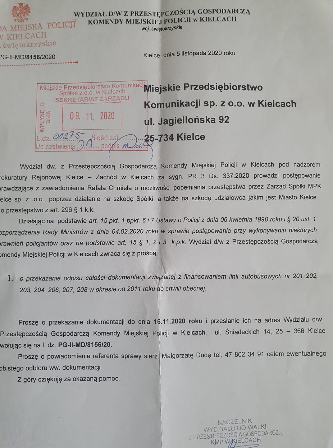 Ze zdumieniem przyjęliśmy informacje o złożonym przez Pana wspólnie z jednym z przewoźników R. Chmiel oraz Stowarzyszeniem Bezpieczny Autobus reprezentowanym przez P. Antosiewicza, Zawiadomieniu do prokuratury a działaniu Zarządu na szkodę Spółki MPK. Odbieramy to jako kolejne działanie polityczne wpisujące się w narrację prowadzoną przez niektóre osoby z Pana otoczenia, których działania zmierzają do całkowitego zdyskredytowania Spółki MPK, w której gmina Kielce jest wspólnikiem i wyeliminowania z rynku wzorem świętokrzyskich PKS-ów.