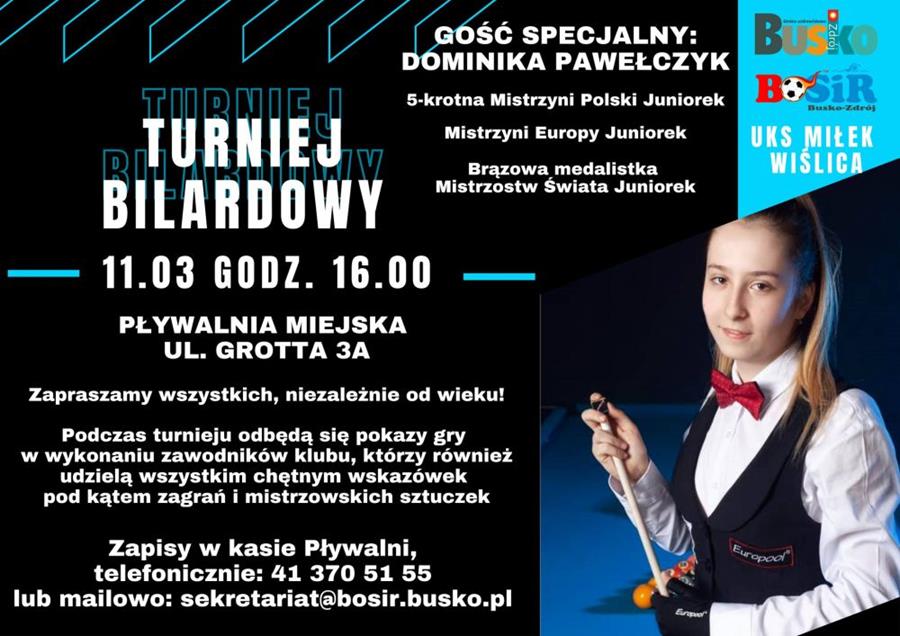 Serdecznie zapraszamy wszystkich, niezależnie od wieku na Turniej Bilardowy! W piątek, 11 marca o godz. 16:00 na Pływalni Miejskiej w Busku-Zdroju przy ul. Grotta 3a. – informuje na swej e-stronie Buski Ośrodek Sportu i Rekreacji